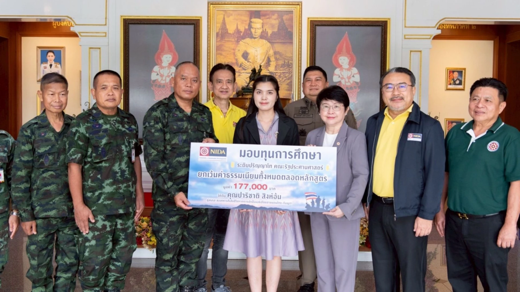 ‘นิด้า’ มอบทุนการศึกษา ‘คุณปาริชาติ สิงห์อ้น’ คู่สมรสของ ‘สิบเอกจิรายุ สิงห์อ้น’ ทหารกล้าที่เสียชีวิตจากการปกป้องอธิปไตยชายแดนไทย-กัมพูชา และ ‘ร้อยตรี เกียรติวงศ์ สถาวร’ ทหารที่ได้รับบาดเจ็บจากการปฏิบัติหน้าที่ พร้อมมอบเงินสนับสนุน เพื่อเป็นขวัญกำลังใจแก่ทหารกล้าและครอบครัว