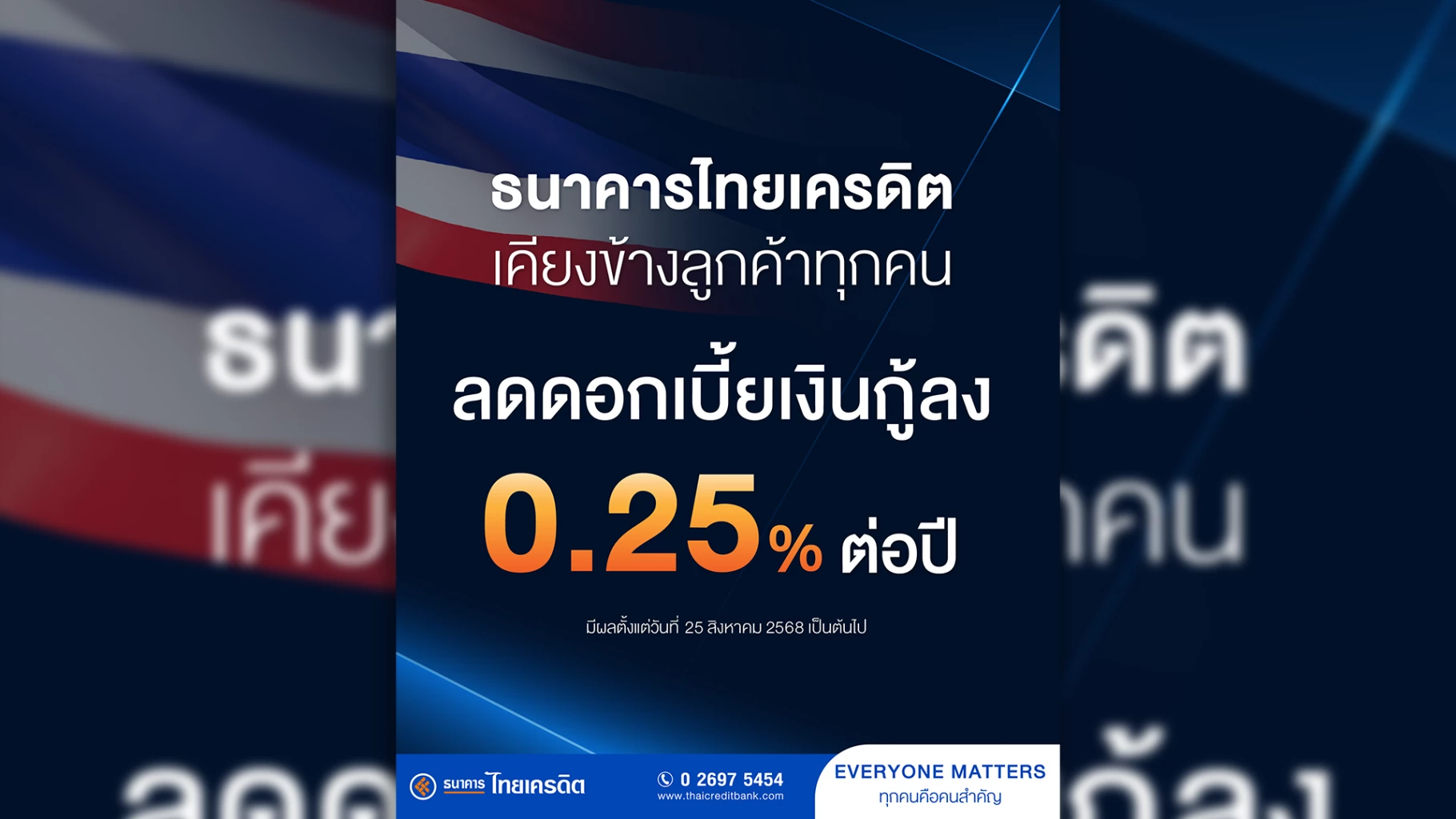 ธนาคารไทยเครดิต เคียงข้างลูกค้าทุกคน ปรับลดอัตราดอกเบี้ยเงินกู้ลง 0.25% ต่อปี