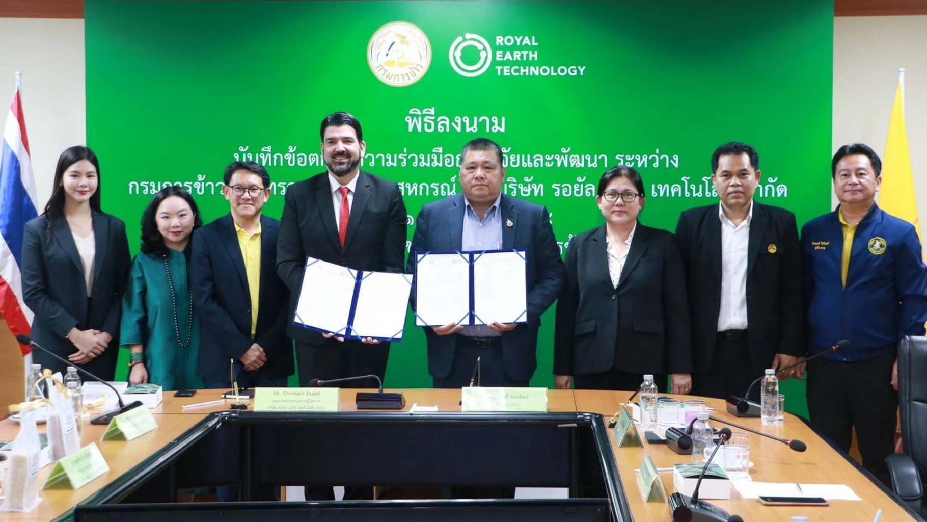 วันจันทร์ที่ 1 กันยายน 2568 นายณัฏฐกิตติ์ ของทิพย์ อธิบดีกรมการข้าว พร้อมด้วย นายคริสเตียน ดูกัล รองประธานกรรมการผู้จัดการ บริษัท รอยัล เอิร์ท เทคโนโลยี จำกัด ได้ร่วมลงนามบันทึกข้อตกลงความร่วมมือทางวิชาการ (MOU) ระหว่าง กรมการข้าว และบริษัท รอยัล เอิร์ท เทคโนโลยี จำกัด โดยมี นายสมหมาย เลิศนา รักษาการในตำแหน่งผู้เชี่ยวชาญด้านเทคโนโลยีการผลิตข้าว นางสาวอมรรัตน์ อินทร์มั่น ผู้อำนวยการสถาบันวิทยาศาสตร์ข้าวแห่งชาติ รักษาราชการแทนผู้อำนวยการกองวิจัยและพัฒนาข้าว นายเตชิต ทิวาเรืองรอง ที่ปรึกษาอาวุโสฝ่ายพัฒนาธุรกิจ บริษัท รอยัล เอิร์ท เทคโนโลยี จำกัด และนางสาวณชญาภา วุฒิภัทรโสภณ ผู้จัดการฝ่ายการตลาดและประชาสัมพันธ์ บริษัท รอยัล เอิร์ท เทคโนโลยี จำกัด ร่วมเป็นสักขีพยาน ณ ห้องประชุมรวงข้าว ชั้น 2 อาคารกรมการข้าว