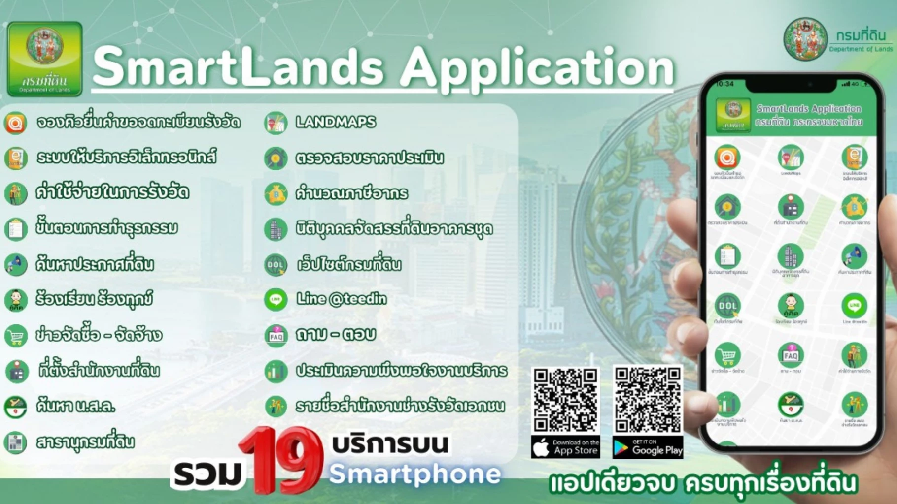 นวัตกรรมการให้บริการประชาชนเรื่องที่ดินบนโทรศัพท์มือถือ ให้บริการประชาชน รวม 19 บริการ อาทิ นัดหมายจดทะเบียนล่วงหน้า (e-QLands) , การค้นหารูปแปลงที่ดิน (LandsMaps) ,คำนวณภาษีอากร ,ขั้นตอนการทำธุรกรรม เป้นต้น