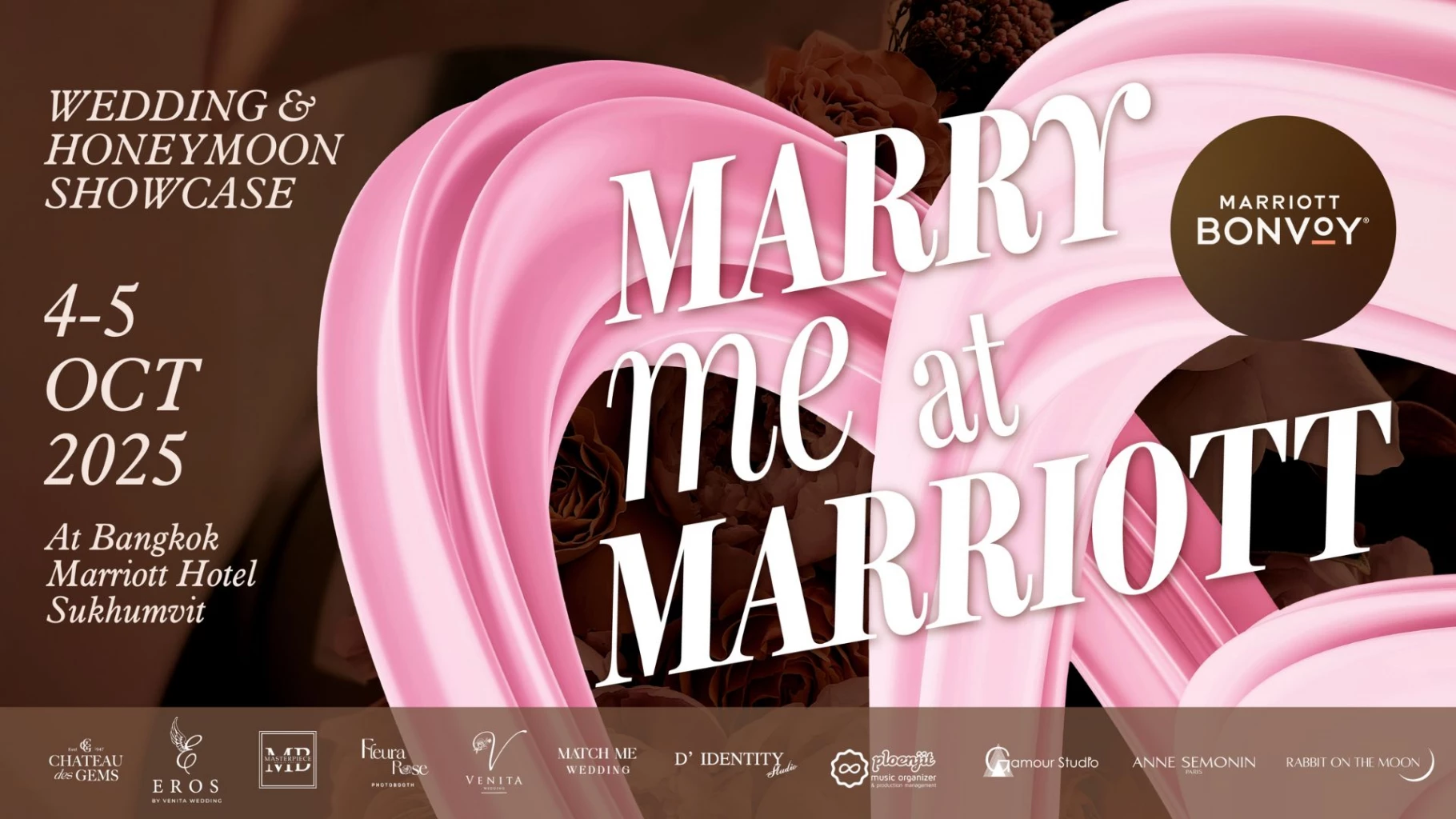 งาน “Marry Me at Marriott” จะจัดขึ้นที่ห้องเบญจสิริบอลรูม โรงแรมแบงค็อก แมริออท สุขุมวิท ในวันเสาร์และอาทิตย์ที่ 4 และ 5 ตุลาคม 2568 สำหรับข้อมูลเพิ่มเติม กรุณาเข้าไปที่เว็บไซต์