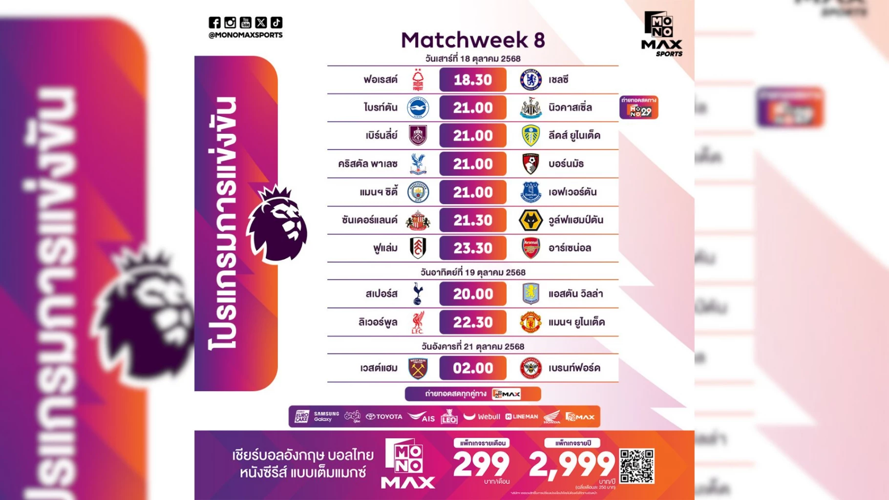 เปิดฉาก วันเสาร์ที่ 18 ตุลาคม 2568 ตั้งแต่หัวค่ำ เวลา 18:30 น. ด้วยเกมใหญ่ที่ซิตี้กราวด์ เมื่อ น็อตติ้งแฮม ฟอเรสต์ เปิดบ้านต้อนรับการมาเยือนของ เชลซี เกมนี้ถือเป็นด่านทดสอบสำคัญของ “สิงห์บลู” ที่ต้องการ 3 คะแนนเพื่อขยับเข้าใกล้พื้นที่หัวตาราง รับชมทาง Monomax เข้าสู่ช่วงไพรม์ไทม์ เวลา 21:00 น. ความเข้มข้นยกระดับขึ้นทันทีเมื่อหลายสนามเตะพร้อมกัน เริ่มจาก ไบรท์ตัน เปิดบ้านรับมือ นิวคาสเซิล ยูไนเต็ด สองทีมเกมรุกจัดจ้านที่ต่างมุ่งเก็บชัยเพื่อยึดตำแหน่งในกลุ่มบนของตารางคะแนน ถ่ายทอดสดพิเศษทั้งทาง Monomax และ ช่อง MONO29 ในเวลาเดียวกัน เบิร์นลีย์ พบ ลีดส์ ยูไนเต็ด ที่เทิร์ฟมัวร์ ซึ่งเป็นแมตช์ของสองทีมที่เน้นเกมรุกเปิดแลกเต็มกำลัง รับชมทาง Monomax ขณะเดียวกันที่เซลเฮิร์สท์ พาร์ค คริสตัล พาเลซ จะเปิดบ้านพบกับ บอร์นมัธ ในเกมที่ทั้งสองฝ่ายต่างมีเดิมพันสำคัญ รับชมทาง Monomax อีกหนึ่งคู่ใหญ่ในเวลาเดียวกัน แมนเชสเตอร์ ซิตี้ เปิดรังเอติฮัดรับมือ เอฟเวอร์ตัน กับภารกิจที่ต้องเก็บ 3 แต้มเพื่อเกาะอันดับกลุ่มหัวตาราง รับชมทาง Monomax และยังไม่จบเพียงเท่านี้ ซันเดอร์แลนด์ เปิดสนามรับมือ วูล์ฟแฮมป์ตัน ในเวลาเดียวกัน โดยเป็นแมตช์ที่มีความสำคัญต่อเส้นทางหนีโซนท้ายตาราง รับชมทาง Monomax ปิดท้ายค่ำวันเสาร์ เวลา 23:30 น. กับเกมที่น่าจับตา ฟูแล่ม เปิดบ้านรับการมาเยือนของจ่าฝูง อาร์เซน่อล ซึ่งต้องการ 3 คะแนนเต็มเพื่อยึดตำแหน่งบนสุดของตารางต่อไป รับชมทาง Monomax