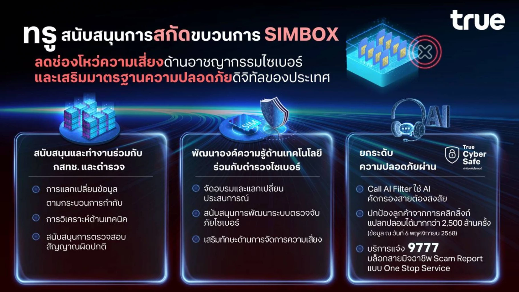 ที่ผ่านมา ทรู มุ่งมั่นสกัดกั้นกลโกงมิจฉาชีพที่ซับซ้อนและเปลี่ยนรูปแบบตลอดเวลา ควบคู่กับการยกระดับความปลอดภัยผ่าน True CyberSafe เกราะป้องกันภัยดิจิทัลสำหรับลูกค้าด้วยบริการ Call AI Filter คัดกรองสายต้องสงสัยด้วย AI และช่วยปกป้องลูกค้าจากการคลิกลิ้งก์แปลกปลอมไปแล้วกว่า 2,531,905,914 ล้านครั้ง (ข้อมูล ณ วันที่ 6 พฤศจิกายน 2568) นอกจากนี้ยังมีบริการแจ้ง 9777 บล็อกสายมิจฉาชีพ Scam Report แบบ One Stop Service ให้ประชาชนแจ้งบล็อกสายต้องสงสัยได้ทันที. พร้อมผสานส่งต่อข้อมูลให้เจ้าหน้าที่ตำรวจอย่างรวดเร็ว ความร่วมมือครั้งนี้ ตอกย้ำการทำงานเชิงรุกร่วมกับทุกภาคส่วนแบบไร้รอยต่อ