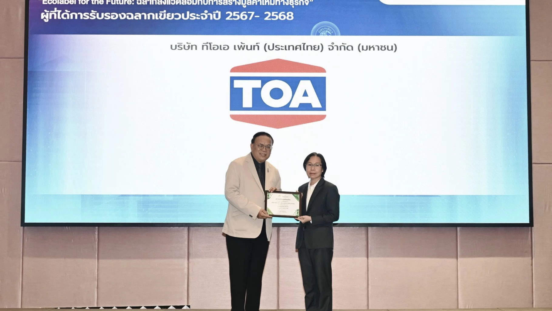 บริษัท ทีโอเอ เพ้นท์ (ประเทศไทย) จำกัด (มหาชน) หรือ TOA ผู้นำนวัตกรรมสีทาอาคารอันดับหนึ่ง เคมีภัณฑ์ก่อสร้าง และวัสดุก่อสร้างรักษ์โลก ตอกย้ำภาพลักษณ์องค์กรที่รับผิดชอบต่อสิ่งแวดล้อมและสังคมอย่างเป็นรูปธรรม เข้ารับ "ฉลากเขียว" สำหรับผลิตภัณฑ์สีและแผ่นยิปซัม ซึ่งเป็นฉลากสิ่งแวดล้อมที่ได้รับการยอมรับและน่าเชื่อถือมาอย่างยาวนาน โดยมี นางสาววิภาดา นาคไพรัช ผู้อำนวยการสายงาน SHE & Quality Management and Sustainability ของ TOA พร้อมด้วย นายศุภชัย หิรัญญนิธิวัฒนา ประธานเจ้าหน้าที่บริหาร บริษัท ยิปมั่นเทค จำกัด เข้ารับเกียรติบัตร "ฉลากเขียว" จาก ดร.วิจารย์ สิมาฉายา ผู้อำนวยการสถาบันสิ่งแวดล้อมไทย ประธานในพิธี ณ โรงแรมทีเค. พาเลซ แอนด์ คอนเวนชั่น กรุงเทพฯ