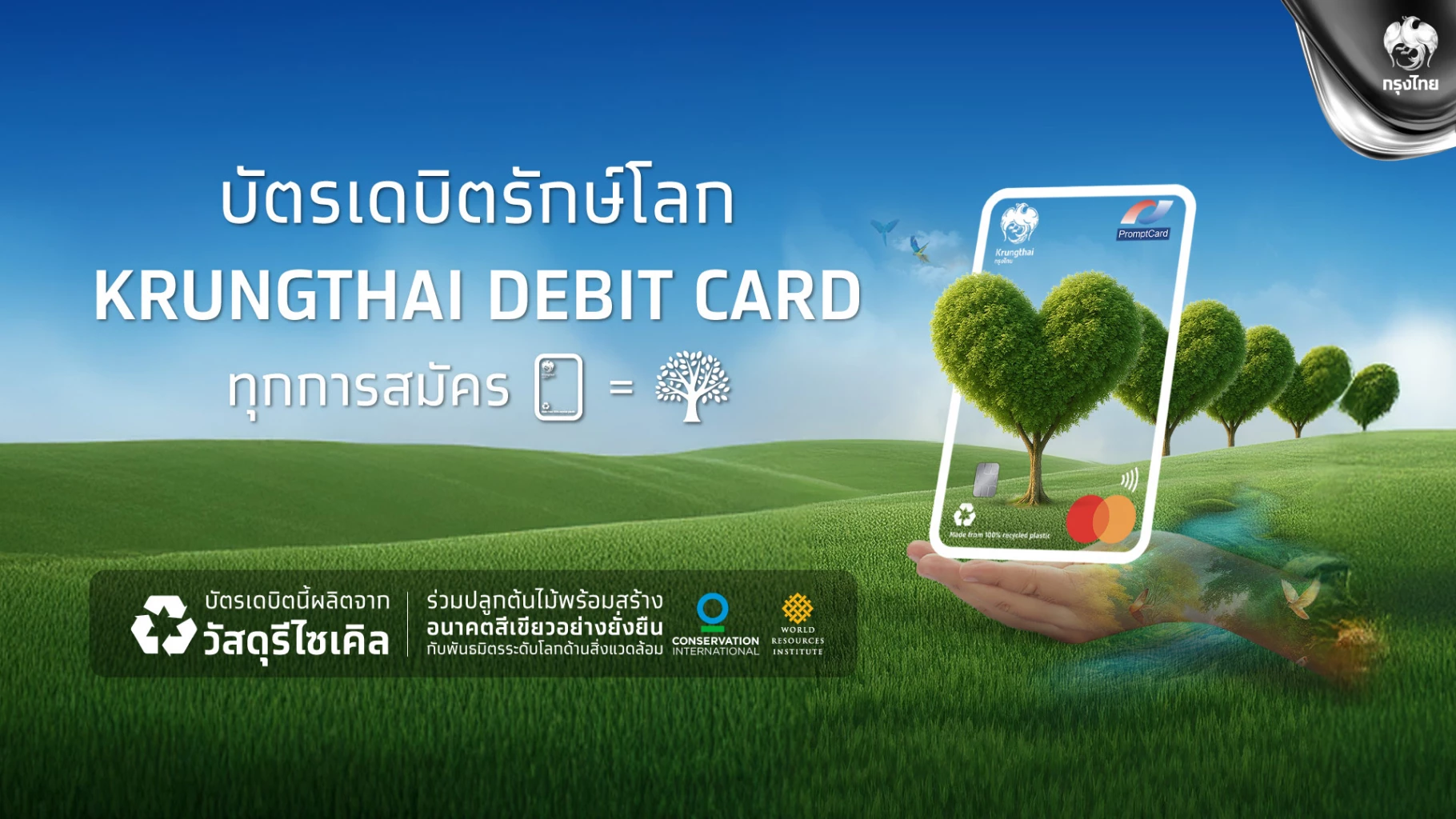 ธนาคารกรุงไทย ตอกย้ำความมุ่งมั่นในการขับเคลื่อนสังคมไทยสู่ความยั่งยืน จับมือ มาสเตอร์การ์ด และพันธมิตรระดับโลก Conservation International (CI) และ World Resources Institute (WRI) เปิดตัว “บัตรเดบิตกรุงไทย มาสเตอร์การ์ด ลายรักษ์โลก” ภายใต้โครงการ Priceless Planet Coalition (PPC) ซึ่งเป็นความร่วมมือระดับนานาชาติของมาสเตอร์การ์ด ที่ตั้งเป้าปลูกต้นไม้ 100 ล้านต้นทั่วโลก รวมถึงประเทศไทย โดยทุกการสมัครบัตร 1 ใบ เท่ากับการร่วมปลูกต้นไม้ 1 ต้น เพื่อเพิ่มพื้นที่สีเขียวและคืนสมดุลให้กับธรรมชาติ