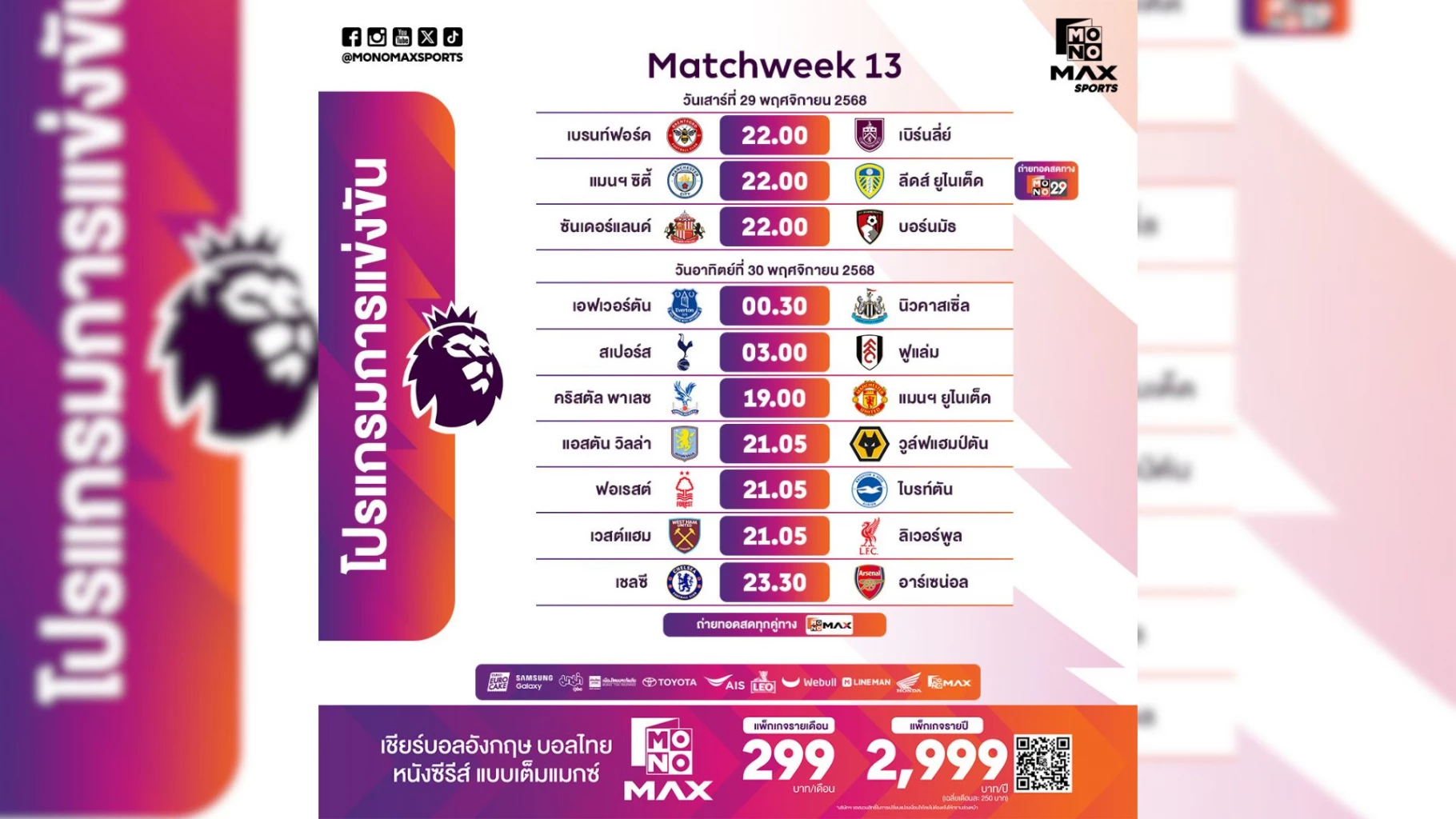 เริ่มต้นการแข่งขันในค่ำคืน วันเสาร์ที่ 29 พฤศจิกายน 2568 เวลา 22.00 น. พร้อมกัน 3 คู่ ถ่ายทอดสดทาง Monomax โดยคู่แรก เบรนท์ฟอร์ด พบ เบิร์นลีย์ เป็นเกมสำคัญของทีมในโซนล่างตารางที่ต้องการแต้มอย่างยิ่ง ในเวลาเดียวกัน ซันเดอร์แลนด์ พบ บอร์นมัธ เป็นการดวลกันของสองทีมที่ต้องการสร้างความต่อเนื่องในฟอร์มการเล่น และอีกหนึ่งคู่ที่ถือเป็นเกมที่ได้รับการจับตามอง นั่นคือ แมนเชสเตอร์ ซิตี้ เปิดรังรับ ลีดส์ ยูไนเต็ด ในแมตช์ที่ทั้งสองทีมเน้นเกมบุกเป็นพิเศษ ซึ่งคู่นี้ถ่ายทอดสดพิเศษทั้ง Monomax และ ช่อง MONO29