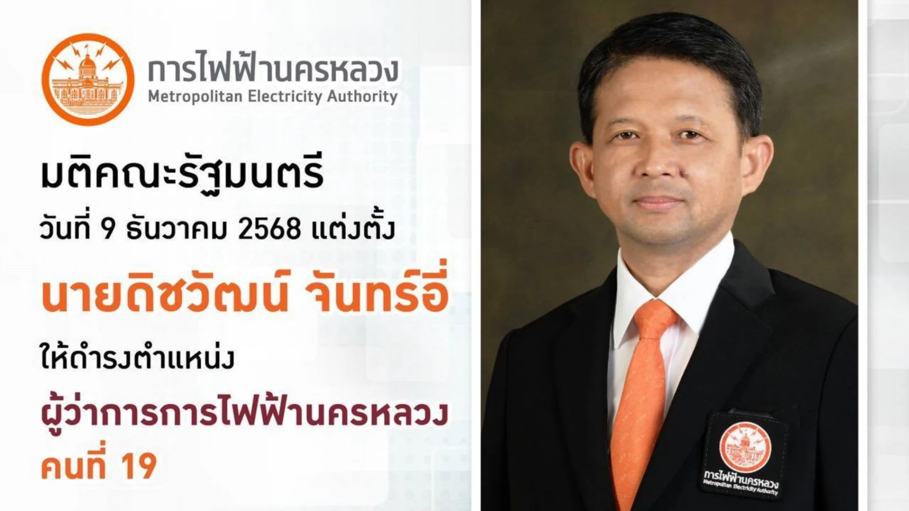 วันนี้ (9 ธันวาคม 2568) ที่ประชุมคณะรัฐมนตรี มีมติอนุมัติแต่งตั้ง นายดิชวัฒน์ จันทร์อี่ ให้ดำรงตำแหน่งผู้ว่าการการไฟฟ้านครหลวง ทั้งนี้ให้มีผลตั้งแต่วันที่ลงนามในสัญญาจ้างเป็นต้นไป แต่ไม่ก่อนวันที่ 17 ธันวาคม 2568