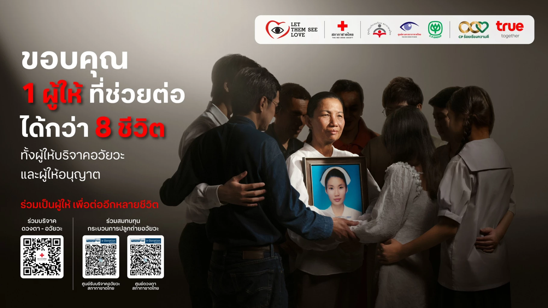 โครงการ “Let Them See Love” ดำเนินมาอย่างต่อเนื่องเป็นปีที่ 19 โดยเป็นความร่วมมือระหว่างเครือเจริญโภคภัณฑ์ ทรู คอร์ปอเรชั่น ศูนย์ดวงตา และศูนย์รับบริจาคอวัยวะ สภากาชาดไทย เพื่อรณรงค์การบริจาคอวัยวะ ดวงตา และทุนทรัพย์ในการสนับสนุนค่าใช้จ่ายที่เกี่ยวข้องกับกระบวนการปลูกถ่าย สำหรับในปีนี้ ได้มีการจัดทำภาพยนตร์โฆษณาชุดพิเศษ “ขอบคุณผู้ให้” ซึ่งถ่ายทอดความเสียสละอันยิ่งใหญ่ของ “ญาติผู้บริจาค” ผู้มีบทบาทสำคัญในการตัดสินใจมอบอวัยวะและดวงตาจากผู้เสียชีวิตจากภาวะสมองตายให้กับผู้ป่วยที่ยังมีความหวัง โดยปัจจุบันมีผู้ป่วยที่รอรับการปลูกถ่ายอวัยวะและดวงตาจำนวนมากกว่า 19,555 ราย