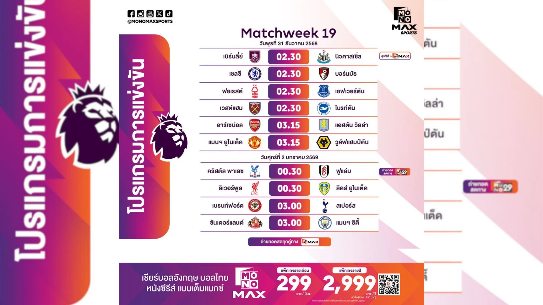 ประเดิมปีใหม่ในวันศุกร์ที่ 2 มกราคม 2569 เวลา 00.30 น. (คืนวันพฤหัสที่ 1 มกราคม 2569) คริสตัล พาเลซ พบ ฟูแลม ซึ่งคู่นี้ถ่ายทอดสดพิเศษทั้ง Monomax และ ช่อง MONO29 ต่อด้วยบิ๊กแมตช์ที่แฟนบอลรอคอย ลิเวอร์พูล เปิดแอนฟิลด์ดวล ลีดส์ ยูไนเต็ด เกมที่ “หงส์แดง” หวังเดินหน้าล่าแต้มเต็ม ยิงสดผ่าน Monomax จากนั้น เวลา 03.00 น.