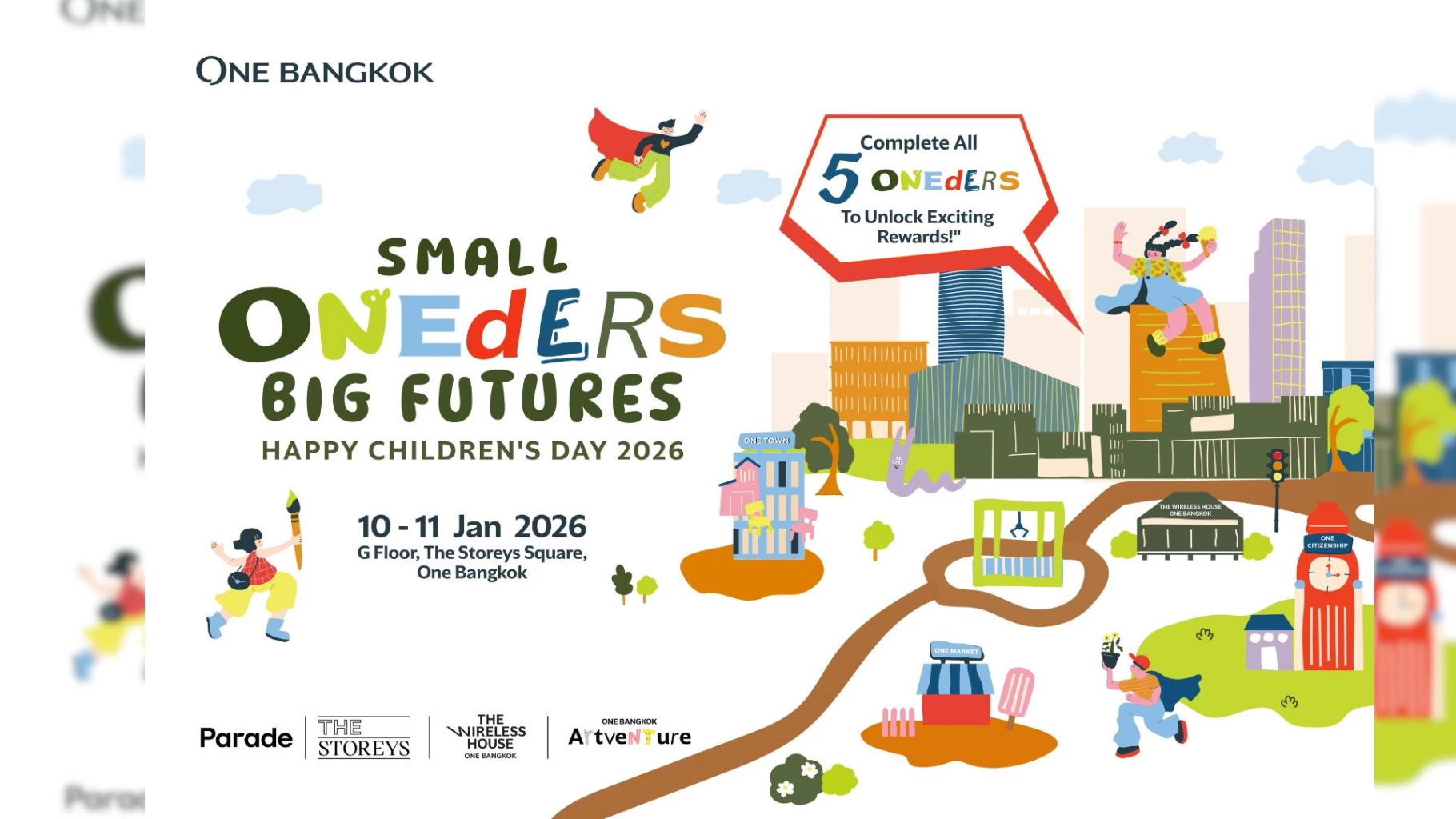 มาร่วมสร้างแรงบันดาลใจและปลดปล่อยจินตนาการที่ไม่รู้จบในงานวันเด็กสุดยิ่งใหญ่ “Small Oneders Big Futures” ในวันเสาร์ที่ 10 และวันอาทิตย์ที่ 11 มกราคม 2569 เวลา 10:00 – 21:00 น. ทั่วทั้งโครงการ วัน แบงค็อก ติดตามข่าวสารและโปรโมชันล่าสุดผ่านแอปพลิเคชัน One Bangkok, เว็บไซต์ www.onebangkok.com หรือ Facebook Page: One Bangkok, Facebook Page: One Bangkok Retail IG: parade.onebangkok, thestoreys.onebangkok Line: @onebangkokretail