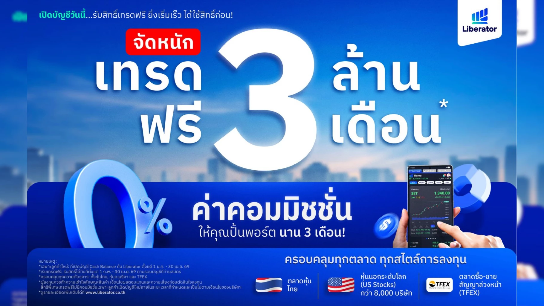 บริษัทหลักทรัพย์ ลิเบอเรเตอร์ จำกัด (Liberator) เดินหน้าปลดล็อกอุปสรรคสำคัญของการลงทุน เปิดตัวแคมเปญใหม่ “เทรด 3 ล้าน ฟรี 3 เดือน” มอบสิทธิพิเศษเทรดฟรีค่าคอมมิชชั่น (0% Commission) สำหรับลูกค้าใหม่ที่เปิดบัญชีประเภท Cash Balance ระหว่างวันที่ 1 มกราคม – 30 เมษายน 2569 เพื่อช่วยให้ผู้ที่กำลังตัดสินใจเริ่มลงทุนสามารถเริ่มได้จริงและเร็วขึ้น ครอบคลุมทุกสไตล์การลงทุนทั้งหุ้นไทย หุ้นสหรัฐฯ และ TFEX