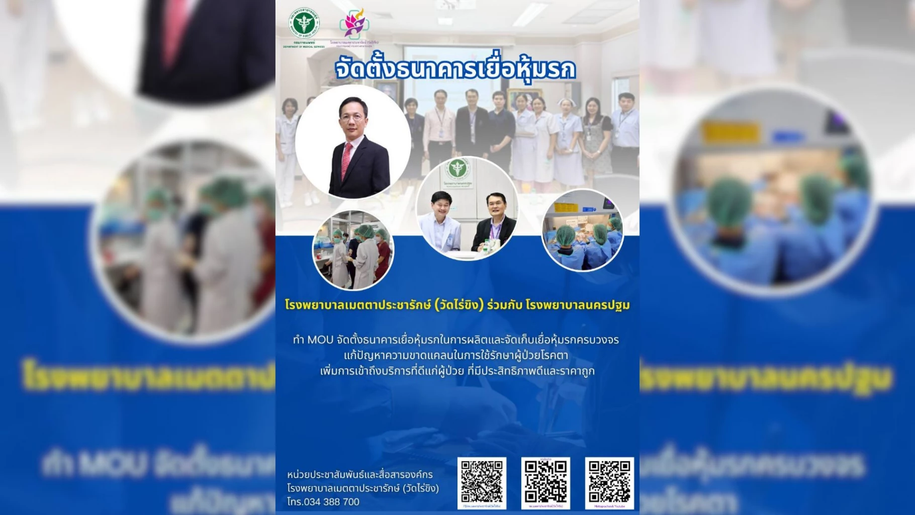 โรงพยาบาลเมตตาประชารักษ์ (วัดไร่ขิง) ร่วมกับโรงพยาบาลนครปฐมทำ MOU จัดตั้งธนาคารเยื่อหุ้มรกในการผลิตและจัดเก็บเยื่อหุ้มรกครบวงจร แก้ปัญหาความขาดแคลนในการใช้รักษาผู้ป่วยโรคตา เพิ่มการเข้าถึงบริการที่ดีแก่ผู้ป่วยที่มีประสิทธิภาพดีและราคาถูก