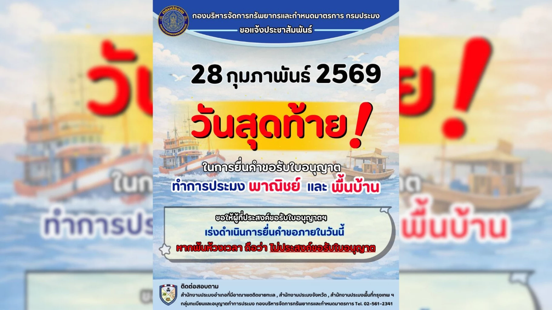 ด่วน! วันสุดท้ายยื่นขอใบอนุญาตประมงพาณิชย์-พื้นบ้าน ปี 69-70