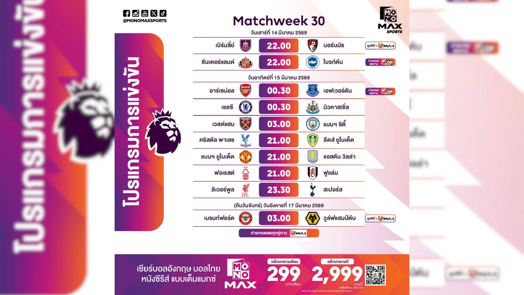 เริ่มต้นกันในคืน วันเสาร์ที่ 14 มีนาคม 2569 เวลา 22.00 น. Monomax ถ่ายทอดสดสองสนาม โดย เบิร์นลีย์ เปิดบ้านพบ บอร์นมัธ เกมของสองทีมที่ต้องการแต้มสำคัญเพื่อสร้างความมั่นใจในช่วงท้ายฤดูกาล ขณะที่อีกสนามถ่ายทอดสดทั้ง Monomax และ ช่อง MONO29 ซันเดอร์แลนด์ รับมือ ไบรท์ตัน เกมนี้เปิดหน้าแลกกันสนุกตั้งแต่ต้นเกม ก่อนเข้าสู่วันอาทิตย์ที่ 15 มีนาคม 2569 เวลา 00.30 น. (คืนวันเสาร์ที่ 14 มีนาคม 2569) สองทีมใหญ่ลงสนามพร้อมกัน โดย อาร์เซน่อล เปิดบ้านรับการมาเยือนของ เอฟเวอร์ตัน ซึ่งเป็นเกมสำคัญของเจ้าถิ่นที่ต้องการรักษามาตรฐานผลงานในช่วงโค้งสุดท้าย ขณะเดียวกัน เชลซี เตรียมรับมือ นิวคาสเซิล ยูไนเต็ด ซึ่งเป็นการพบกันของสองทีมที่มีศักยภาพเกมรุกอันตรายและมีเป้าหมายเก็บคะแนนเพื่อรักษาโอกาสในการขยับอันดับ และ เวลา 03.00 น. แมนเชสเตอร์ ซิตี้ ต้องออกไปเยือน เวสต์แฮม ยูไนเต็ด ทำให้เกมนี้มีแนวโน้มเป็นอีกหนึ่งแมตช์ที่ต้องอาศัยความเฉียบคมในการจบสกอร์และการจัดการเกมที่รัดกุม
