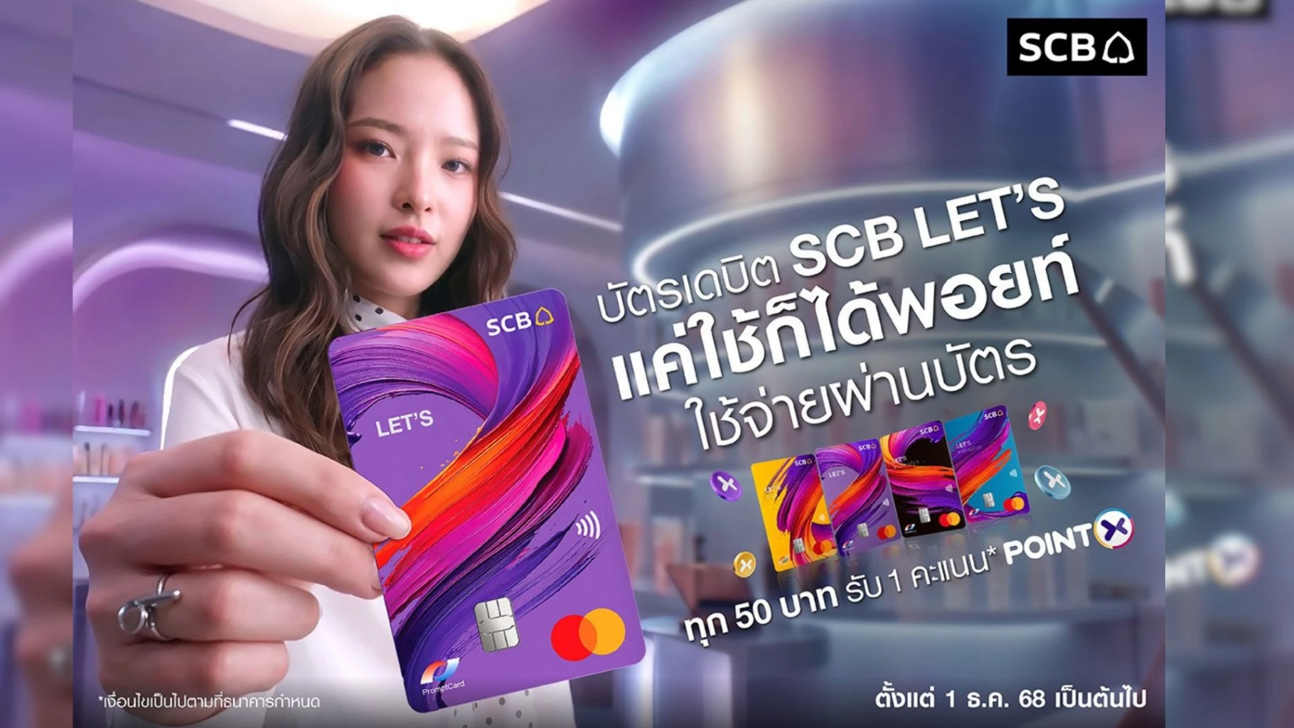 - มอบสิทธิพิเศษสำหรับผู้ถือบัตรเดบิต SCB LET’S ทุกประเภท ทุกการใช้จ่ายผ่านบัตรครบ 50 บาท รับ 1 คะแนนสะสม* บนแพลตฟอร์ม POINTX