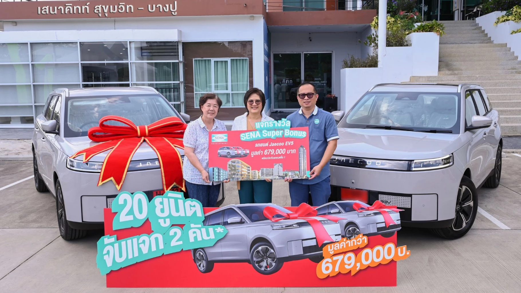 บริษัท เสนาดีเวลลอปเม้นท์ จำกัด (มหาชน) หรือ SENA โดย นางสมพิศ ศรีระทัด ผู้ช่วยกรรมการผู้จัดการ มอบรางวัล รถยนต์ไฟฟ้า Jaecoo 5 EV Long Range Max ให้ผู้โชคดีแล้ว 2 คัน รวมมูลค่ากว่า 1.35 ล้านบาท จากแคมเปญ “SENA SUPER BONUS” ตอกย้ำแนวคิด แจกจริง ไม่มีเงื่อนไขซับซ้อน โดยผู้ได้รับรางวัล ได้แก่ นางเหม่ย หุ้ย หง หวู และนายสมโภช มาลัยทอง ลูกบ้านเสนา จากโครงการ เสนาคิทท์ สุขุมวิท–บางปู แคมเปญดังกล่าวมาพร้อมข้อเสนอที่คุ้มค่า ผู้ซื้อคอนโดมีโอกาสลุ้นรับ รถยนต์ไฟฟ้า Jaecoo 5 EV มูลค่า 679,000 บาท พร้อมประกันชั้น 1 ซึ่งคิดเป็นมูลค่ากว่า ครึ่งหนึ่งของราคาคอนโดบางยูนิต ส่งผลให้ได้รับการตอบรับจากลูกบ้านและผู้ที่กำลังมองหาคอนโดพร้อมอยู่เป็นอย่างดี บริษัทจึงขยายระยะเวลาแคมเปญถึงวันที่ 30 เมษายนนี้