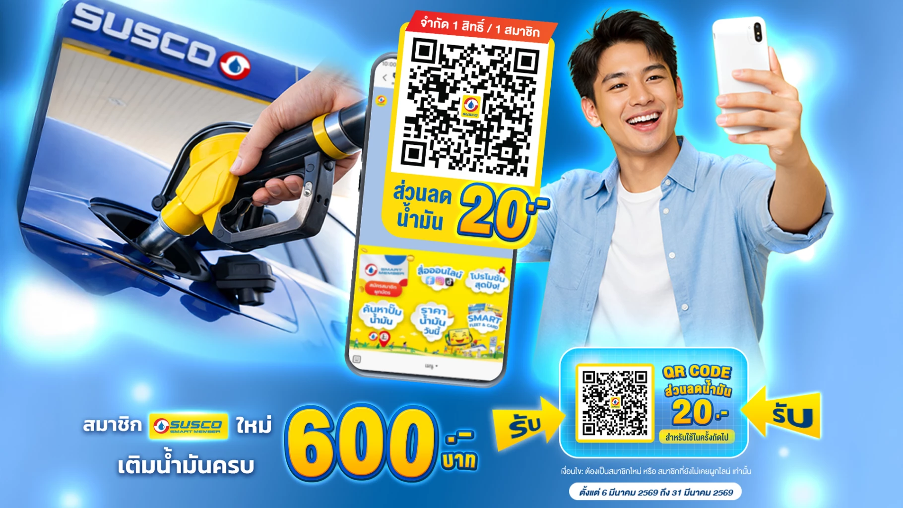 บมจ.ซัสโก้ (SUSCO) ต้อนรับซัมเมอร์ ออกโปรฯ สำหรับสมาชิกใหม่แบบเริ่ดๆ เพียงสมัครสมาชิก SUSCO SMART MEMBER เติมน้ำมันครบ 600 บาท และแจ้งสะสมคะแนนรับ QR Code ส่วนลด 20 บาท ทันที! สำหรับนำไปใช้เป็นส่วนลดการเติมน้ำมันในครั้งถัดไป แต่ขอกระซิบว่าจำกัด 1 สิทธิ์ต่อสมาชิกเท่านั้น แค่เป็นเพื่อนกับ SUSCO ก็รับสิทธิ์ง่ายๆ เริ่มวันนี้ - 31 มี.ค.69 ที่ปั๊มน้ำมัน SUSCO ทุกสาขาทั่วปรเทศ…. บอกเลยได้ทั้งขึ้นทั้งล่อง เพราะ เติม 1 ลิตร ได้รับ 1 คะแนน คะแนนสามารถนำไปแลกเป็นส่วนลดน้ำมัน และของรางวัลอื่นๆ ได้อีกมากมาย!!... อย่างรอช้า! รีบมาสมัครเป็นครอบครัวเดียวกันกับ SUSCO เพียงสแกน QR Code หรือ Add Line : @SUSCO คลิก https://bit.ly/SUSCOLINEOfficialAccount ได้เลยคร้าาา