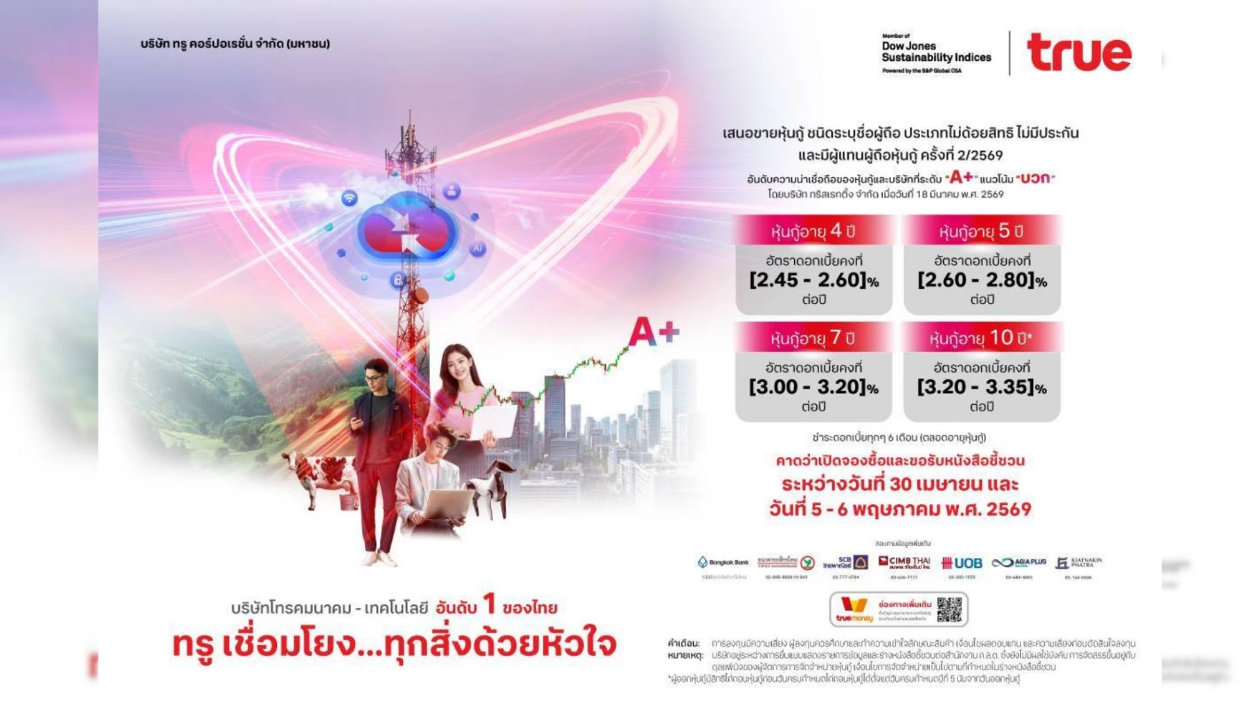 บริษัท ทรู คอร์ปอเรชั่น จำกัด (มหาชน) (บริษัทฯ) บริษัทโทรคมนาคมเทคโนโลยีชั้นนำของไทย และได้รับการจัดอันดับติด Top 1% บริษัทที่มีความยั่งยืนที่สุดของโลกจาก S&P Global ต่อเนื่องเป็นปีที่ 8 ตามรายงาน Sustainability Yearbook 2026 ตอกย้ำสถานะธุรกิจที่มั่นคงและศักยภาพการเติบโตอย่างยั่งยืนในระยะยาว เตรียมเสนอขายหุ้นกู้ชุดใหม่แก่ผู้ลงทุนทั่วไปจำนวน 4 ชุด อายุ 4 – 10 ปี พร้อมอัตราดอกเบี้ยคงที่ [2.45 – 3.35]% ต่อปี และอันดับความน่าเชื่อถือที่ระดับ “A+” แนวโน้มเครดิตได้รับการปรับขึ้นจาก “คงที่ (Stable)” เป็น “บวก (Positive)” โดยบริษัท ทริสเรทติ้ง จำกัด เมื่อวันที่ [19 มีนาคม 2569] สวนกระแสภาวะเศรษฐกิจในปัจจุบัน สะท้อนความเชื่อมั่นของพื้นฐานธุรกิจที่แข็งแกร่ง รวมถึงบทบาทของทรูในการพัฒนาโครงสร้างพื้นฐานดิจิทัลของประเทศ คาดเปิดให้จองซื้อระหว่างวันที่ 30 เมษายน และ วันที่ 5 - 6 พฤษภาคม 2569 ผ่าน 7 สถาบันการเงินชั้นนำได้แก่ ธ.กรุงเทพ ธ.กสิกรไทย ธ.ไทยพาณิชย์ ธ.ซีไอเอ็มบีไทย ธ.ยูโอบี บล.เกียรตินาคินภัทร และ บล.เอเซีย พลัส รวมถึงการขายผ่านแอปพลิเคชัน TrueMoney Wallet โดยมี ธ.กรุงศรีอยุธยา เป็นนายทะเบียนหุ้นกู้และผู้แทนผู้ถือหุ้นกู้