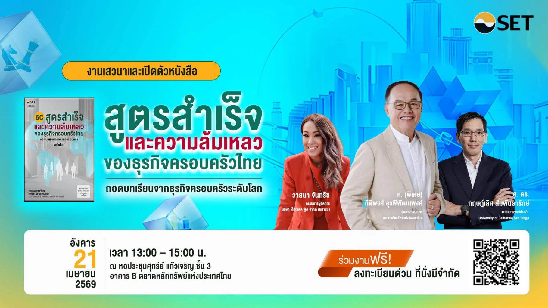 ตลาดหลักทรัพย์แห่งประเทศไทย ชวนเจ้าของกิจการ ทายาทธุรกิจ และผู้ที่สนใจ ร่วมงานเสวนาและเปิดตัวหนังสือ “สูตรสำเร็จและความล้มเหลวของธุรกิจครอบครัวไทย: ถอดบทเรียนจากธุรกิจครอบครัวระดับโลก” ในวันอังคารที่ 21 เมษายน 2569 เวลา 13.00-15.00 น. ณ ตลาดหลักทรัพย์ฯ เพื่อเจาะลึกเคล็ดลับความสำเร็จ พร้อมเรียนรู้จากบทเรียนจริงของธุรกิจครอบครัวระดับโลกหลากหลายมิติ นำมาใช้เป็นแนวทางวางรากฐานบริหารธุรกิจครอบครัวให้เติบโตอย่างยั่งยืนจากรุ่นสู่รุ่น ผ่านมุมมองจากวิทยากรผู้ทรงคุณวุฒิระดับแนวหน้า นำโดย ศาสตราจารย์พิเศษ กิติพงศ์ อุรพีพัฒนพงศ์ ประธานกรรมการ ตลาดหลักทรัพย์ฯ และ คุณวาสนา จันทรัช กรรมการผู้จัดการ บริษัท เอ็กโซติค ฟู้ด จำกัด (มหาชน) ดำเนินรายการโดย ศาสตราจารย์ ดร.กฤษฎ์เลิศ สัมพันธารักษ์ ศาสตราจารย์ประจำ University of California San Diego
