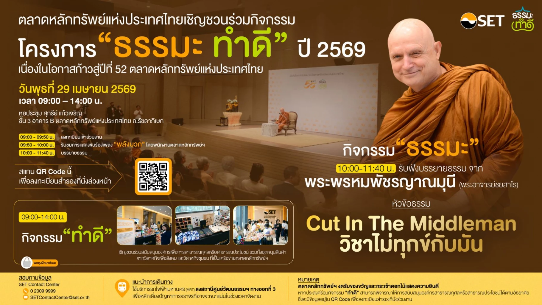 ตลาดหลักทรัพย์แห่งประเทศไทย ชวนผู้ลงทุน ประชาชน และผู้สนใจร่วมกิจกรรมโครงการ “ธรรมะ ทำดี ปี 2569” เนื่องในโอกาสก้าวสู่ปีที่ 52 ตลาดหลักทรัพย์ฯ กำหนดจัดขึ้นในวันพุธที่ 29 เมษายน 2569 เวลา 09.00 - 14.00 น. ณ อาคารตลาดหลักทรัพย์ฯ โดยแบ่งเป็น 2 กิจกรรม ได้แก่