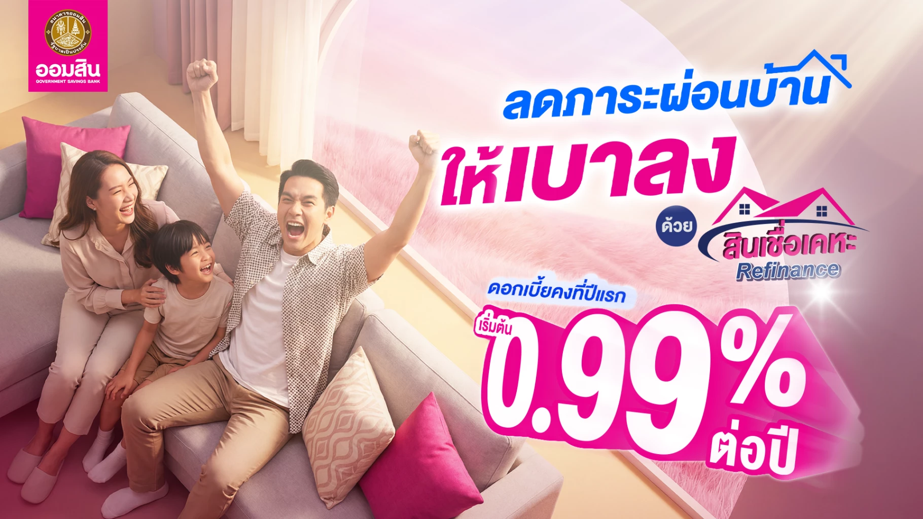 ผ่อนบ้านสบายใจกว่าเดิม! ออมสินส่งสินเชื่อรีไฟแนนซ์จัดเต็มดอกเบี้ยคงที่ปีแรกเพียง 0.990% พร้อมฟรีค่าประเมินและค่าจดจำนองสูงสุด 2 แสนบาท ช่วยเปลี่ยนยอดผ่อนหนักให้เป็นเบาเพื่อเพิ่มความสุขให้ครอบครัว