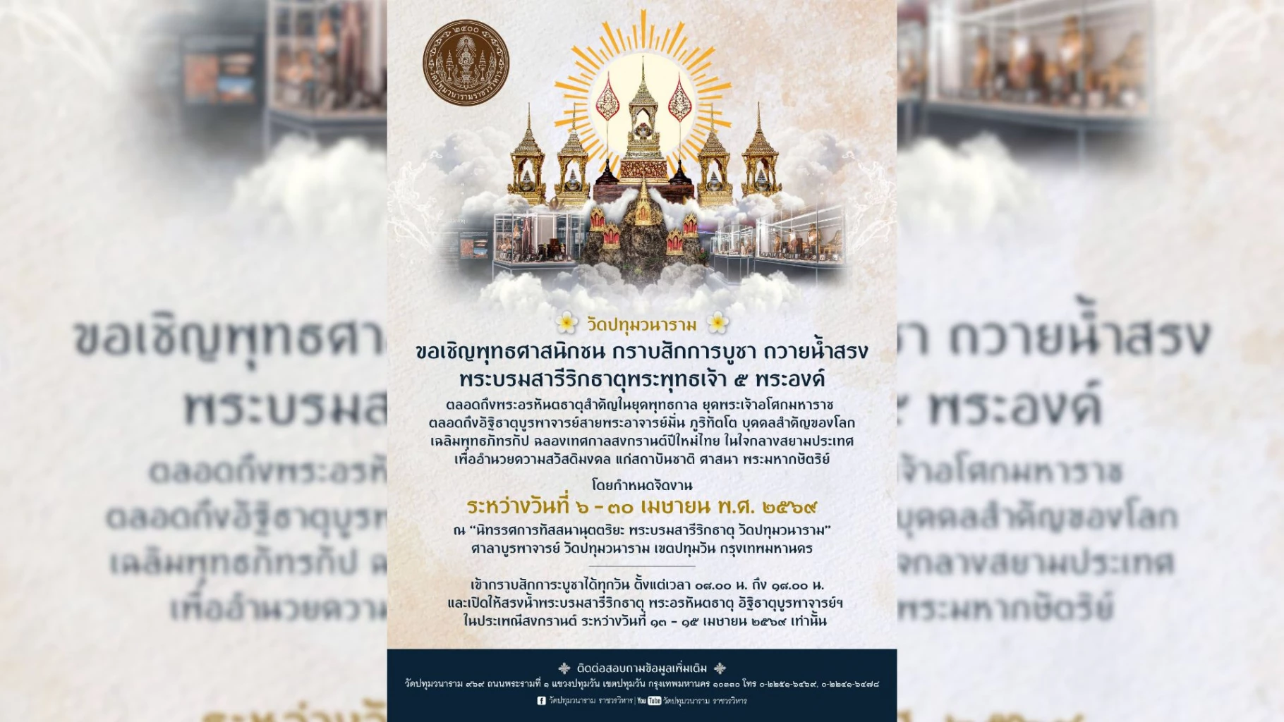 วัดปทุมวนาราม ราชวรวิหาร ใจกลางกรุงเทพมหานคร เปิดประสบการณ์ทางศาสนาครั้งสำคัญ เชิญพุทธศาสนิกชนและประชาชนร่วมกราบสักการะ “พระบรมสารีริกธาตุพระพุทธเจ้า 5 พระองค์” ที่ถูกรวมไว้ในพื้นที่เดียวกันอย่างสมบูรณ์ ภายในนิทรรศการ “ทัสสนานุตตริยะ” พร้อมเปิดโอกาสให้ร่วมสรงน้ำเพื่อความเป็นสิริมงคลในช่วงเทศกาลปีใหม่ไทย