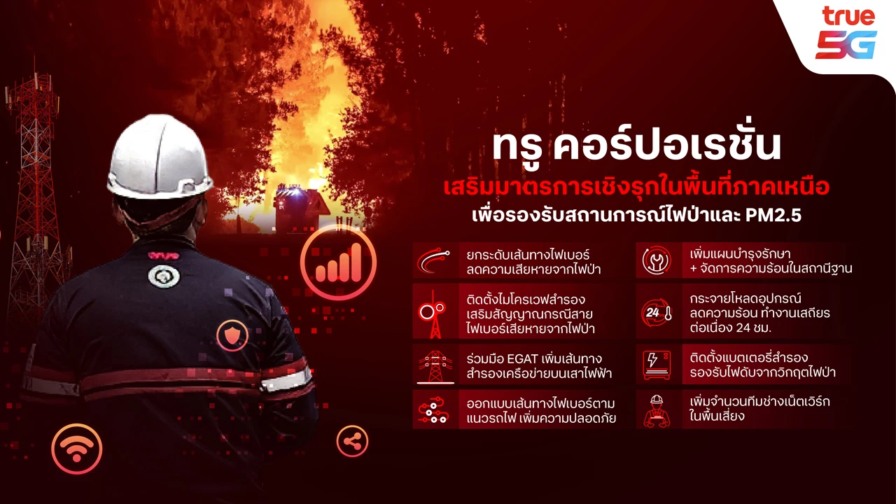 ทรู คอร์ปอเรชั่น เสริมมาตรการเชิงรุกเพิ่มประสิทธิภาพโครงข่ายพื้นที่ภาคเหนือรองรับสถานการณ์ไฟป่า และ PM 2.5 ได้แก่