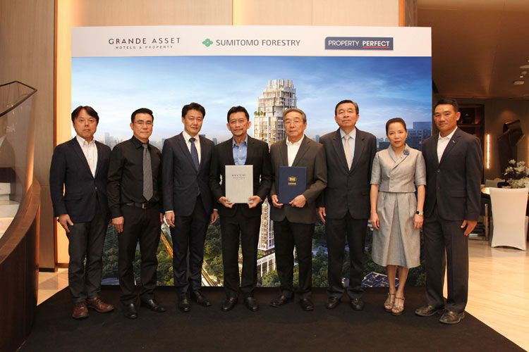 คุณวิทวัส วิภากุล (ที่ 4 จากซ้าย) ประธานเจ้าหน้าที่บริหาร ธุรกิจอสังหาริมทรัพย์ บริษัท แกรนด์ แอสเสท โฮเทลส์ แอนด์ พรอพเพอร์ตี้ จำกัด (มหาชน) ร่วมลงนามสัญญากับ คุณวัชระ จิรังบุญกุล (ที่ 4 จากขวา) ประธานกรรมการบริหารกลุ่มบริษัท สี่พระยาก่อสร้าง จำกัด เพื่อแต่งตั้งให้เป็นผู้ดำเนินการก่อสร้างโครงการ HYDE Heritage Thonglor (ไฮด์ เฮอริเทจ ทองหล่อ) โครงการคอนโดมิเนียมระดับซูเปอร์ลักซ์ชัวรี่ใจกลางเมือง มูลค่าโครงการโดยประมาณ 6,000 ล้านบาท ตั้งอยู่ริมถนนสุขุมวิท ใกล้สถานี BTS ทองหล่อเพียง 5 นาที ภายใต้การร่วมทุนระหว่าง บริษัท พร็อพเพอร์ตี้ เพอร์เฟค จำกัด (มหาชน), บริษัท แกรนด์ แอสเสท โฮเทลส์ แอนด์ พรอพเพอร์ตี้ จำกัด และบริษัท ซูมิโตโม ฟอเรสทรี จำกัด ซึ่งเป็นบริษัทญี่ปุ่นที่มีประวัติยาวนานกว่า 300 ปีในธุรกิจที่อยู่อาศัยทั้งในและต่างประเทศ โดยมี มร.อะซึฮิสะ โอกุระ กรรมการบริษัท แกรนด์สตาร์ จํากัด, คุณสมศักดิ์ ชัยพิทูรสวัสดิ์ รองประธานเจ้าหน้าที่บริหาร ฝ่ายก่อสร้าง, ออกแบบ และพัฒนาโครงการ, คุณวิชชุธร หงส์ประภัสร และคุณวิภาวี จิรังบุญกุล ผู้บริหารระดับสูงบริษัท สี่พระยาก่อสร้าง จำกัด ร่วมเป็นสักขีพยาน ณ Sales Gallery HYDE Heritage Thonglor สุขุมวิท 59 เมื่อเร็วๆ นี้