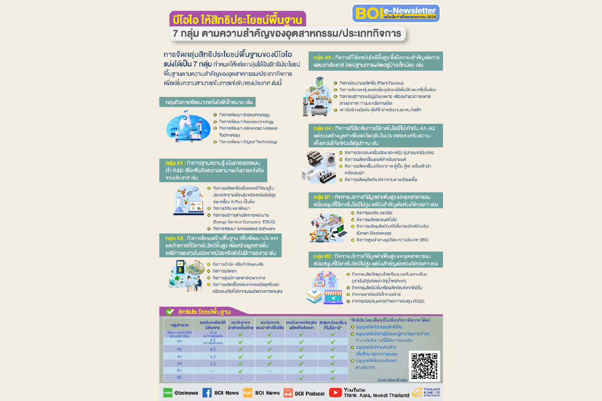 เรื่อง บีโอไอ ให้สิทธิประโยชน์พื้นฐาน 7 กลุ่ม ตามความสำคัญของอุตสาหกรรม/ประเภทกิจการ การจัดกลุ่มสิทธิประโยชน์พื้นฐานของบีโอไอแบ่งได้เป็น 7 กลุ่ม กำหนดให้แต่ละกลุ่มได้รับสิทธิประโยชน์พื้นฐานตามความสำคัญของอุตสาหกรรม/ประเภทกิจการ เพื่อเพิ่มความสามารถในการแข่งขันของประเทศ ดังนี้