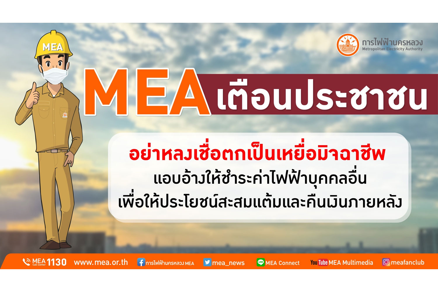 MEA เตือนประชาชนอย่าหลงเชื่อตกเป็นเหยื่อมิจฉาชีพ แอบอ้างให้ชำระค่าไฟฟ้าบุคคลอื่นเพื่อให้ประโยชน์สะสมแต้มและคืนเงินภายหลัง
