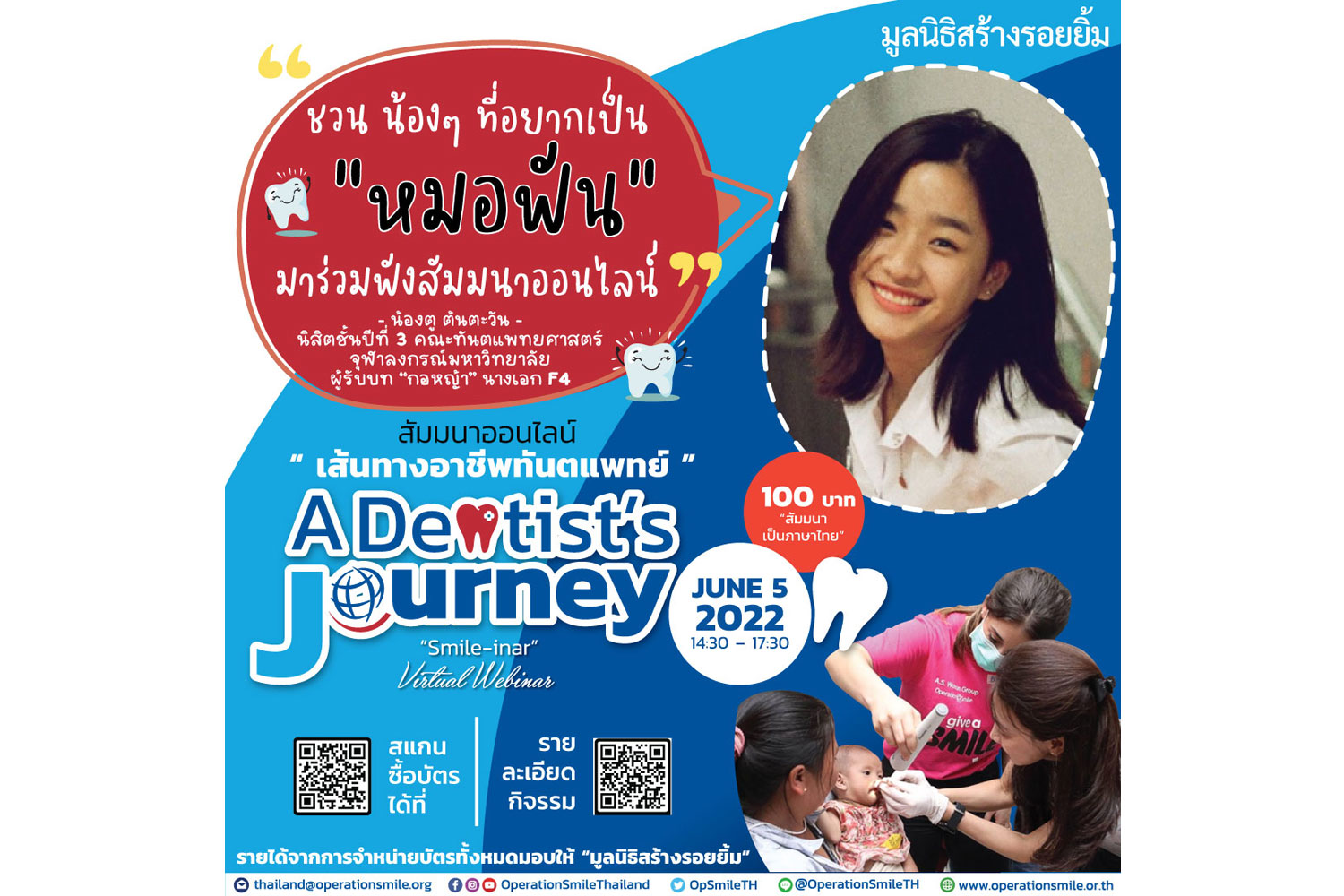 มูลนิธิสร้างรอยยิ้ม จึงจัดกิจกรรมสัมมนาออนไลน์ เพื่อมุ่งหวังจะให้ความรู้ทางการแพทย์แก่นักเรียน ในวันที่ 5 มิถุนายน พ.ศ. 2565 ในงาน เส้นทางการเป็นทันตแพทย์ “A Dentist's Journey" เวลา 14.30-17.30 น. เหมาะ สำหรับนักเรียนที่สนใจอยากสอบ เข้าเรียน คณะทันตแพทย์ เพื่อรับฟังข้อมูล ความรู้ และแนะแนวการศึกษา จากทันตแพทย์ผู้ทรงคุณวุฒิ หลากสาขา และนักศึกษาทันตแพทย์จาก 4 สถาบัน เช่น ตู ต้นตะวัน นิสิตคณะทันตแพทย์ศาสตร์ จากจุฬาฯ และยังมีพี่ๆ จากมหาวิทยาลัยขอนแก่น มหาวิทยาลัยธรรมศาสตร์และมหาวิทยาลัยรังสิตด้วย ราคาบัตรราคา 100 บาท ซื้อบัตรที่ www.ticketmelon.com รายได้ทั้งหมดจากการจำหน่ายบัตรบริจาคให้มูลนิธิสร้างรอยยิ้มเพื่อช่วยเด็กปากแหว่งเพดานโหว่ นอกจากนี้ผู้เข้าฟังทุกคนจะได้รับประกาศนียบัตรจากมูลนิธิ