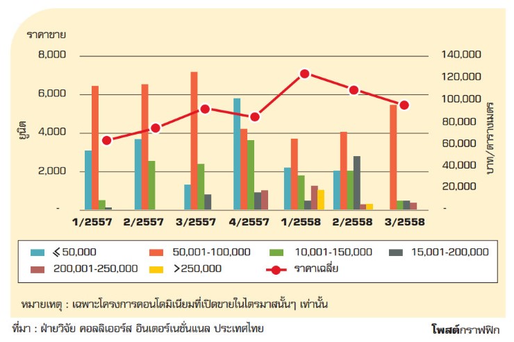 ดังนั้น ผู้ประกอบการส่วนใหญ่ที่เปิดขายคอนโดมิเนียมที่มีราคาขายมากกว่า 2 แสนบาท/ตร.ม.จะนำโครงการไปโรดโชว์ในประเทศอื่นๆ โดยเฉพาะในสิงคโปร์ ฮ่องกง และจีน เพราะต้องหากลุ่มผู้ซื้อชาวต่างชาติมาทดแทนผู้ซื้อชาวไทย ส่วนราคาขายเฉลี่ยของคอนโดมิเนียมที่เปิดขายใหม่ในไตรมาส 3/2558 อยู่ที่ประมาณ 9.75 หมื่นบาท/ตร.ม. ลดลงประมาณ 11% จากไตรมาสก่อนหน้านี้ เพราะว่ามีโครงการระดับลักซ์ชัวรี่เปิดขายในไตรมาส 3 ที่ผ่านมาลดลง โดยแม้ว่าคอนโดมิเนียมราคาขายมากกว่า 2 แสนบาท/ตร.ม. ที่เปิดขายในช่วง 3-4 ไตรมาสที่ผ่านมาจะมียอดขายที่ดี แต่ผู้ประกอบการส่วนใหญ่ยังคงไม่มั่นใจในกำลังซื้อ จำนวนโครงการระดับลักซ์ชัวรี่ีจึงเปิดขายลดลงในไตรมาส 3 ที่ผ่านมา