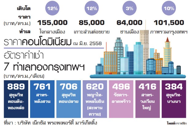 นลินรัตน์ เจริญสุพงษ์ กรรมการผู้จัดการ บริษัท เน็กซัส พรอพเพอร์ตี้ มาร์เก็ตติ้ง กล่าวว่า ภาพรวมราคาคอนโดมิเนียมเฉลี่ยในกรุงเทพฯ ครึ่งปีแรกที่ผ่านมาปรับขึ้น 10% หรือเฉลี่ยอยู่ที่ 101,500 บาท/ตารางเมตร (ตร.ม.) ซึ่งมาจากสองปัจจัยหลัก คือ คอนโดมิเนียมที่เปิดตัวใหม่ในครึ่งปีแรกส่วนใหญ่เป็นคอนโดมิเนียมหรูบนทำเลกลางใจเมืองและใกล้เมือง และจากต้นทุนในการพัฒนาโครงการที่สูงขึ้น