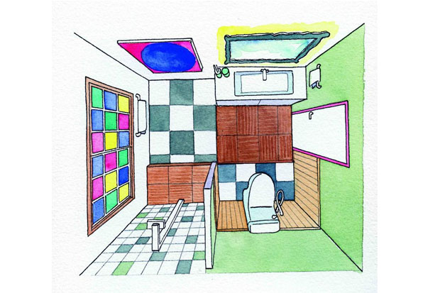 H. ผนังไม่น่าเบื่อ ผนังห้องสีขาว (สีครีม สีชมพู หรือสีอ่อนๆ ที่ไม่ทำร้ายใคร) มองนานๆ ก็เบื่อ ลองเปลี่ยนมาใช้กระเบื้องที่มีสีสันหน่อยก็ได้ เพราะทั้งห้องไม่จำเป็นต้องไปในโทนเดียวกันหมด เติมเข้าไปช่วยหรือผนังด้านไหนไม่โดนน้ำก็สกัดกระเบื้องออกแล้วฉาบปูนทาสีสดใสแทน หรือจะปิดวอลเปเปอร์ก็ดูหรูดี แต่ควรทำในพื้นที่ส่วนแห้ง