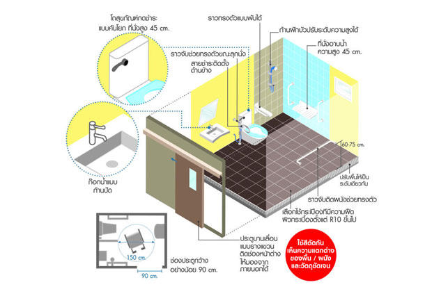 เริ่มต้นที่ขนาดห้องน้ำ หากเป็นไปได้ควรขยายให้กว้างขวาง (มีระยะเผื่อการหมุนตัวขณะนั่ง Wheelchair อย่างน้อย 150 ซม.) ลูกบิดประตูห้องน้ำควรเปลี่ยนมาใช้แบบคันโยก และติดราวจับช่วยทรงตัวด้านข้าง หรือเปลี่ยนเป็นบานเลื่อนแบบรางแขวน (แทนการใช้รางบนพื้นซึ่งอาจทำให้เดินสะดุด) ไม่ควรติดกลอนล็อกประตู แต่ควรมีช่องกระจกสำหรับมองเผื่อเกิดอุบัติเหตุจะได้เข้าช่วยเหลือได้ทันท่วงที