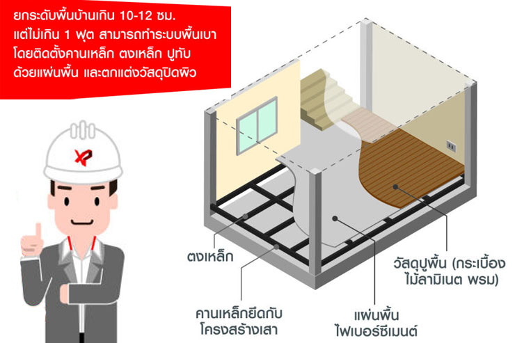 สำหรับวิธีในการยกระดับพื้นจะต่างกันไปตามระดับพื้นที่ต้องการเพิ่ม เช่น ยกระดับเพียง 10-12 ซม. อาจเทคอนกรีตทับพื้นเดิม (หรือเปลี่ยนเป็นวางอิฐมวลเบาแล้วเทคอนกรีตทับเพื่อให้น้ำหนักเบาขึ้น) หากต้องการยกระดับสูงกว่านั้นอาจทำระบบพื้นเบา โดยทำคานเหล็กยึดกับเสาบ้านตามระดับความสูงที่ต้องการวางตงเหล็กพาดแล้วปูวัสดุแผ่นพื้นทับ เช่น ไฟเบอร์ซีเมนต์ เป็นต้น