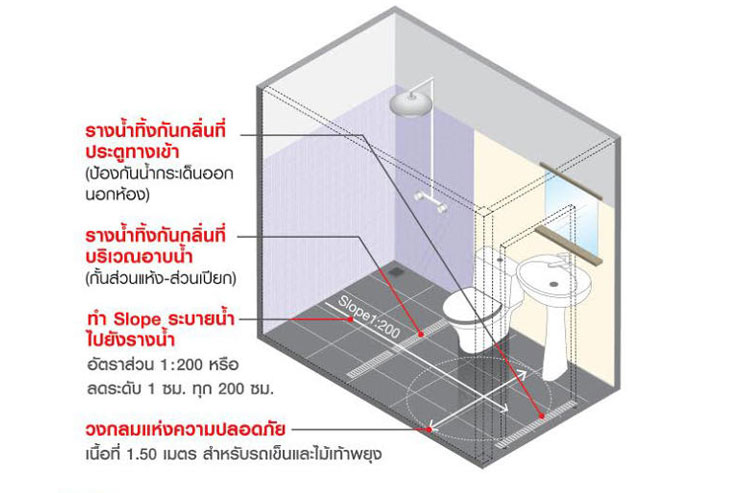 วิธีที่ทำได้คือ การติดตั้งรางระบายน้ำที่มีความยาวตลอดแนวกั้นใน 2 ตำแหน่ง ตำแหน่งแรก คือ “ระหว่างพื้นที่ส่วนแห้งกับส่วนเปียก” ส่วนอีกตำแหน่ง คือ “ระหว่างพื้นที่ในห้องน้ำกับนอกห้องน้ำ” พร้อมทั้งปรับพื้นห้องน้ำให้ลาดเอียงไปยังรางระบายน้ำดังกล่าวด้วยระดับความลาดที่เหมาะสม (ประมาณ 1 : 200 )