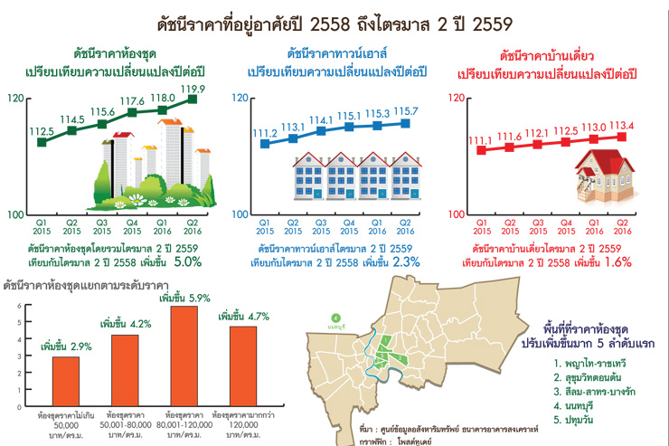 ขณะที่ดัชนีราคาทาวน์เฮาส์ในพื้นที่กรุงเทพฯ นนทบุรี ปทุมธานี และสมุทรปราการ ในไตรมาส 2 ปี 2559 ปรับขึ้น 2.3% เมื่อเทียบกับช่วงเวลาเดียวกันของปีก่อนหน้า หากแยกเป็นดัชนีราคาทาวน์เฮาส์ในเขตกรุงเทพฯ จะปรับขึ้น 2.2% ในขณะที่ดัชนีราคา ทาวน์เฮาส์ใน จ.นนทบุรี ปทุมธานี และสมุทรปราการ ปรับเพิ่มขึ้น 2.4%