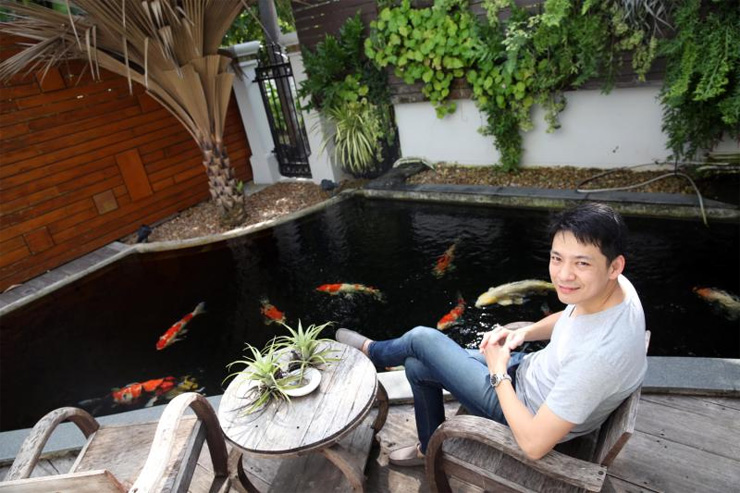 “ปลาคาร์ปผมเลี้ยงไว้เป็น 10 ตัวเลย ทำไมจึงต้องเป็นปลาคาร์ป เพราะเป็นความใฝ่ฝันตั้งแต่เด็ก และคิดว่าถ้ามีบ้านต้องมีพื้นไม้ด้านนอกตรงสระปลาคาร์ป ปลาคาร์ปล็อตแรก 14 ตัว ที่เอามาเลี้ยงราคาหกหมื่นห้าเลยนะ พอเราเริ่มเลี้ยง และผมเลี้ยงเป็น ทุกวันผมจึงได้อยู่กับเขา ได้ทำให้เขาเชื่อง ได้พักผ่อนหย่อนใจที่สระปลาคาร์ปหลังบ้าน เลี้ยงปลาเพื่อให้ในบ้านมีความเคลื่อนไหว เราเล่นกับเขาได้ เพื่อนมาเยี่ยมบ้านก็มาเล่นกับปลาคาร์ปหลังบ้าน ทุกวันว่างๆ ผมไม่อยู่ในสวนก็ต้องที่บ่อปลาคาร์ปอากาศจะดีมากๆ เย็นๆ ผมชอบอยู่บ้าน ผมชอบทำสวน ชอบใช้ชีวิตนอกบ้านคือปลูกต้นไม้เล่นกับปลา ผมไม่ชอบอยู่ในบ้านแล้วเปิดเครื่องปรับอากาศ แต่ชอบชีวิตเอาต์ดอร์นอกบ้านมากกว่าครับ”