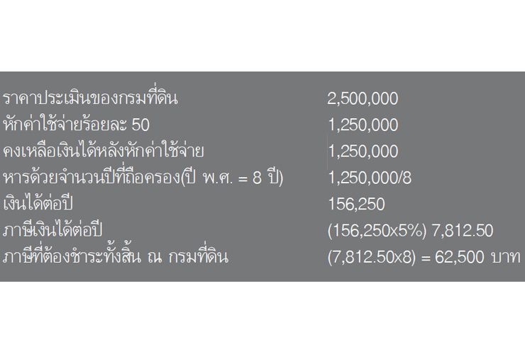 ตัวอย่าง นายเอกได้ที่ดินมรดกจากบิดาที่เสียชีวิตเมื่อปี พ.ศ. 2552 ต่อมาในปี พ.ศ. 2559 นายเอกได้ขายที่ดินดังกล่าวออกไปในราคา 2 ล้านบาท เจ้าพนักงานประเมินกรมที่ดินได้ประเมินราคาขาย 2.5 ล้านบาท นายเอกต้องเสียภาษีเงินได้บุคคลธรรมดาขณะโอนกรรมสิทธิ์ ดังนี้