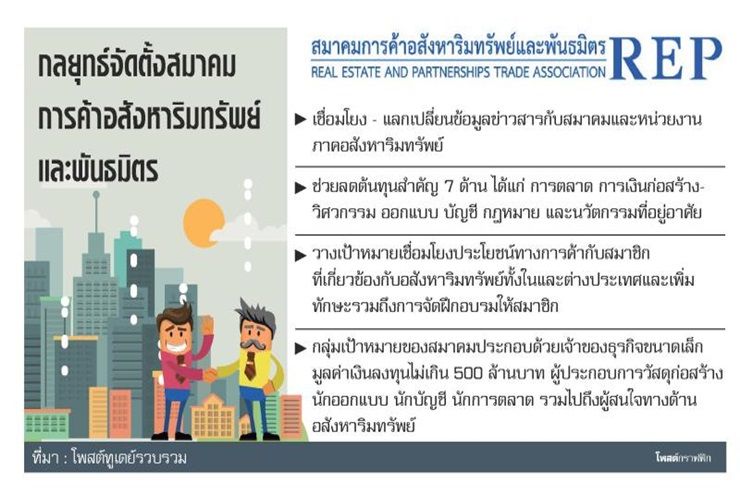 อภิชาติ ประสิทธิ์นฤทธิ์ นายกสมาคมการค้าอสังหาริมทรัพย์และพันธมิตร (REP) กล่าวถึงเหตุผลการจัดตั้งสมาคม ว่า ที่ผ่านมาตนเองเป็นผู้ให้คำปรึกษากับธุรกิจพัฒนาอสังหาริมทรัพย์ รวมถึงเป็นนักพัฒนาอสังหาฯ ในชื่อบริษัท แองเจิ้ล กรุ๊ป จึงมองเห็นโอกาสที่จะสนับสนุนผู้ประกอบการอสังหาริมทรัพย์ โดยเฉพาะรายขนาดเล็กที่มีมูลค่าการลงทุนไม่เกิน 500 ล้านบาท ซึ่งเป็นกลุ่มที่เข้าถึงแหล่งเงินทุนได้ยากให้สามารถพัฒนาและแข่งขันได้อย่างมีประสิทธิภาพ เป็นเหมือนการจัดตั้งคลัสเตอร์ธุรกิจสำหรับภาคอสังหาริมทรัพย์ ซึ่งก่อสร้างเป็นสมาคมการค้า จดทะเบียนกับกระทรวงพาณิชย์