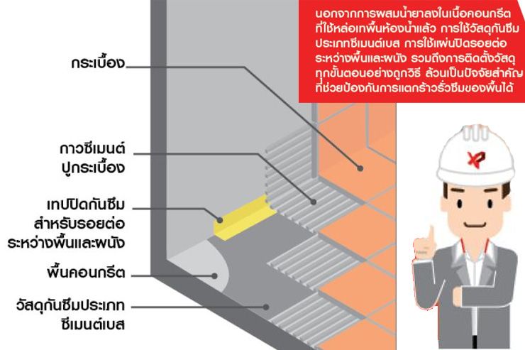 มาถึงตรงนี้ เจ้าของบ้านคงได้ทราบถึงวิธีที่ช่วยป้องกันปัญหาห้องน้ำรั่วด้วยการทำระบบกันซึมบนพื้น แม้จะต้องมีค่าใช้จ่ายเพิ่ม แต่ก็นับว่าคุ้มค่าที่จะลงทุนเมื่อเทียบกับการใช้งานในระยะยาว ทั้งนี้เมื่อเจ้าของบ้านติดตั้งระบบกันซึมแล้ว อย่าลืมให้ความสำคัญกับวัสดุปิดผิวปูพื้น โดยเลือกชนิดวัสดุที่เหมาะสม ติดตั้งด้วยวิธีที่ถูกต้องตามมาตรฐาน รวมถึงหมั่นบำรุงรักษาเป็นประจำโดยใช้น้ำยาทำความสะอาดที่ไม่มีฤทธิ์กัดกร่อนรุนแรงจนเกินไป และหากเป็นกระเบื้องควรหมั่นยาแนวใหม่ทุกปี