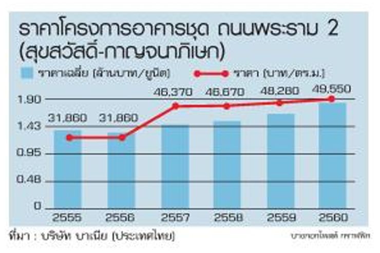ขณะที่ราคาโครงการโดยเฉลี่ยแม้ว่าจะมีแนวโน้มเพิ่มสูงขึ้นในทุกๆ ปี แต่ในพื้นที่นี้ยังคงมีทั้งของถูกและแพงที่ให้ผู้บริโภคสามารถเลือกกันได้ นอกจากนั้น ด้วยศักยภาพของพื้นที่บริเวณพระราม 2 เลยจากแยกตัดถนนกาญจนาภิเษกไปแล้วยังมีพื้นที่เหลืออยู่ เราอาจเห็นการเติบโตของการพัฒนาอสังหาริมทรัพย์ในบริเวณนี้ได้อีกเช่นกัน