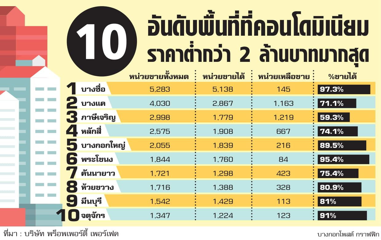 ภัทรชัย กล่าวเพิ่มเติมว่า จากข้อมูลพบว่า 10 อันดับเขตที่มีคอนโดในช่วงราคาขายต่ำกว่า 2 ล้านบาทมากสุดจะอยู่ในพื้นที่นอกใจกลางเมือง ได้แก่ บางซื่อ บางแค ภาษีเจริญ หลักสี่ บางกอกใหญ่ พระโขนง คันนายาว ห้วยขวาง มีนบุรี และจตุจักร ทั้งนี้จากอุปทานที่อยู่ระหว่างการขายกว่า 3.9 หมื่นยูนิต พบว่าแบบ 1 ห้องนอนมีมากที่สุดกว่า 2.9 หมื่นยูนิต หรือ 75.3% และพบว่ารูปแบบห้อง 2 ห้องนอนขายได้มากที่สุดถึง 94.41%