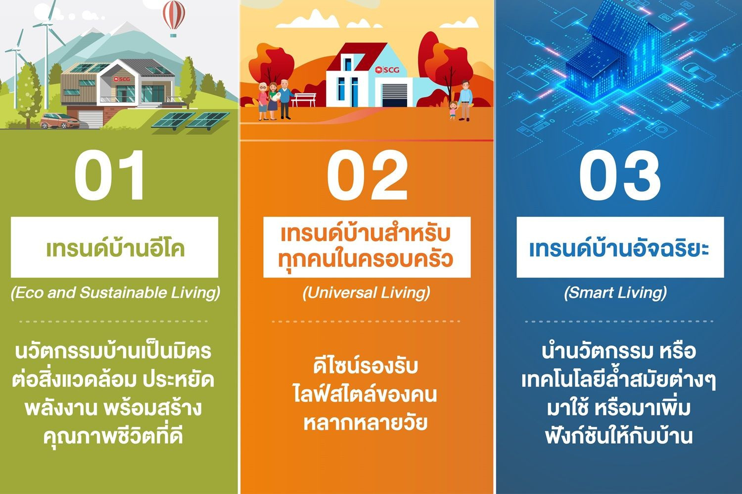 เอสซีจี รวบรวมและอัพเดตเทรนด์บ้าน ที่ไม่เพียงมีดีไซน์ของบ้านที่สวยโดนใจ แต่ยังตอบโจทย์เรื่องฟังก์ชันการใช้งานของสมาชิกทุกคนภายในบ้าน และรองรับพฤติกรรมการอยู่อาศัยของคนยุคใหม่ได้เป็นอย่างดี ได้แก่ เทรนด์บ้านอีโค เทรนด์บ้านสำหรับทุกคนในครอบครัว และเทรนด์บ้านอัจฉริยะ