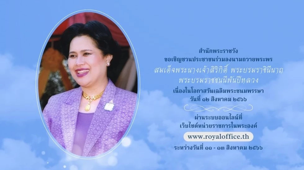 สำนักพระราชวัง เชิญชวนประชาชนร่วมลงนามถวายพระพร "สมเด็จพระนางเจ้าสิริกิติ์ พระบรมราชินีนาถ พระบรมราชชนนีพันปีหลวง"เนื่องในโอกาสวันเฉลิมพระชนมพรรษา 12 สิงหาคม 2566