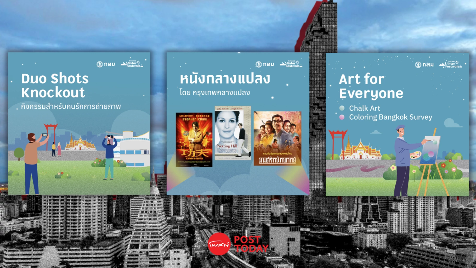 หนังกลางแปลง จะทำการจัดฉายภาพยนตร์ 3 เรื่องโดย กรุงเทพกลางแปลง ภายในงานนี้ตั้งใจนำภาพยนตร์ไทยคุณภาพและภาพยนตร์ต่างชาติบางเรื่องมาพากย์สดให้ชมกันอย่างมีอรรถรส