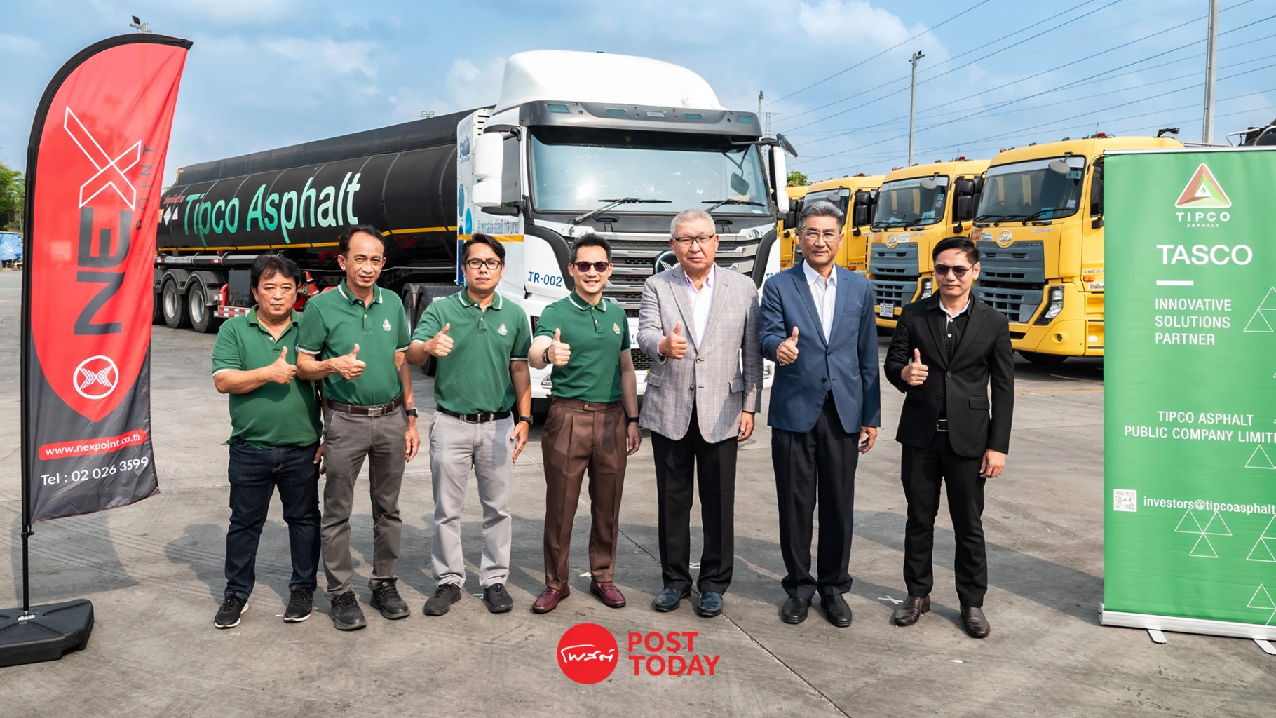 " NEX พร้อมให้ความร่วมมือและสนับสนุนกลุ่มบริษัท ทิปโก้แอสฟัลท์ ซึ่งเป็นพันธมิตรที่เข้มแข็งของ NEX ในการดำเนินธุรกิจที่ให้ความสำคัญต่อ Green Logistics ซึ่งเป็นกระบวนการจัดการด้านการขนส่งที่เป็นมิตรต่อสิ่งแวดล้อม ทั้งยังส่งเสริมแนวคิดด้านนวัตกรรม ประสิทธิภาพเชิงนิเวศเศรษฐกิจ และความปลอดภัยในองค์กรที่ยั่งยืน" นายคณิสสร์ ศรีวชิระประภา ประธานเจ้าหน้าที่บริหาร บริษัท เน็กซ์ พอยท์ จำกัด (มหาชน) ปิดท้าย