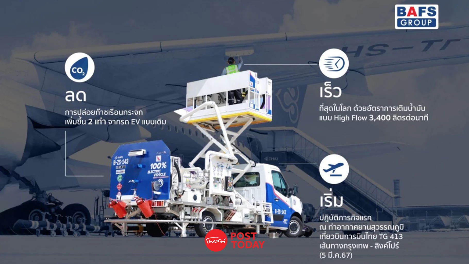 มุ่งสร้างอุตสาหกรรมการบินสู่ความยั่งยืน BAFS เปิดตัว E-VELOX 3400 รถเติมน้ำมันอากาศยานพลังงานไฟฟ้า 100% (100% EV Hydrant Dispenser) คันล่าสุด เริ่มใช้จริงที่ท่าอากาศยานสุวรรณภูมิกับเที่ยวบิน การบินไทย หนุนไทยเป็นศูนย์กลางการบินระดับโลก (Aviation Hub)