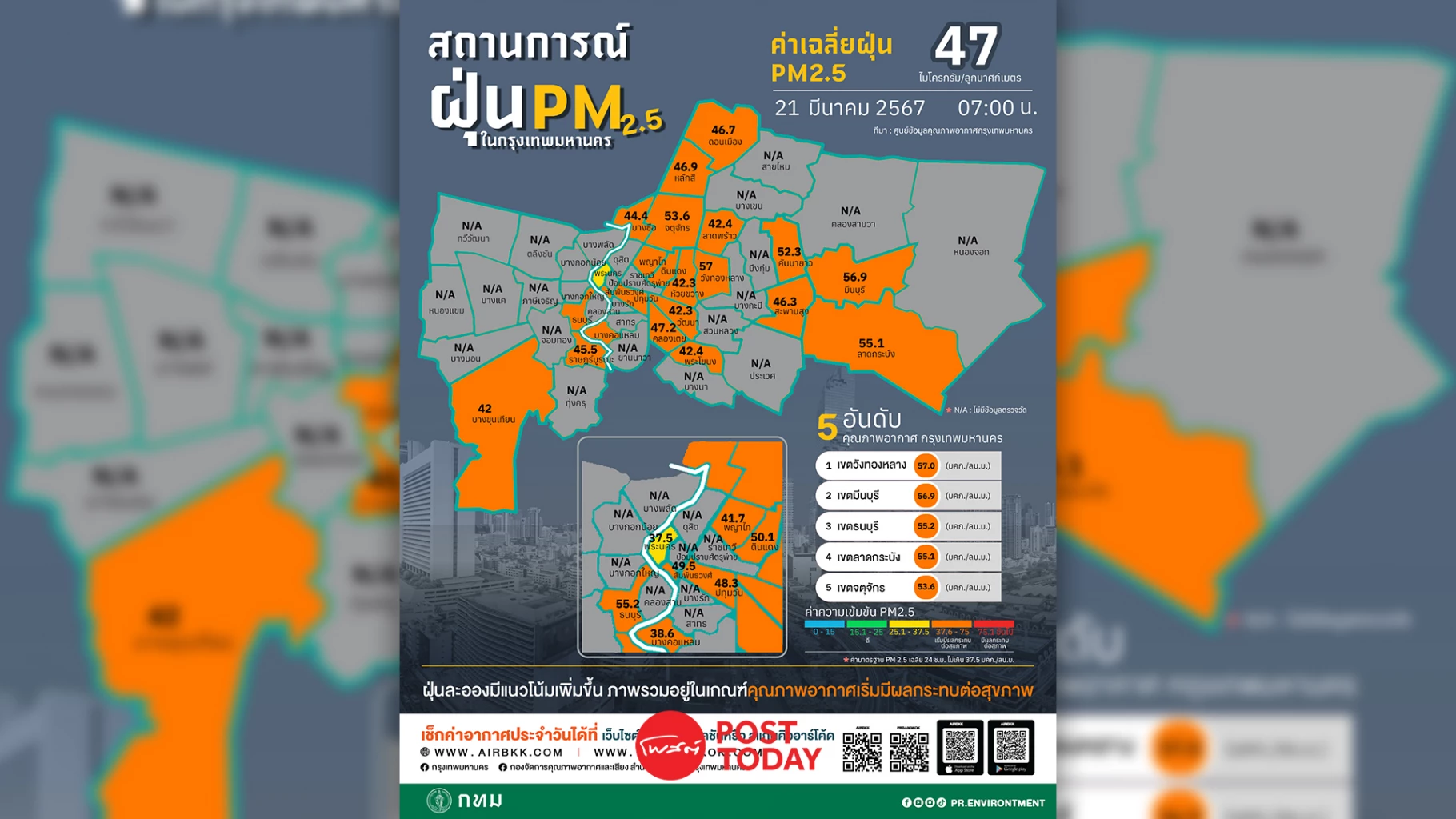 ศูนย์ข้อมูลคุณภาพอากาศกรุงเทพมหานครขอรายงานสถานการณ์ฝุ่นละอองขนาดไม่เกิน 2.5 ไมครอน (PM 2.5) ประจำวันพฤหัสบดีที่ 21 มีนาคม พ.ศ. 2567 เวลา 07.00 น. ค่าเฉลี่ย 24 ชั่วโมง ของฝุ่นละอองขนาดไม่เกิน 2.5 ไมครอน (PM2.5)